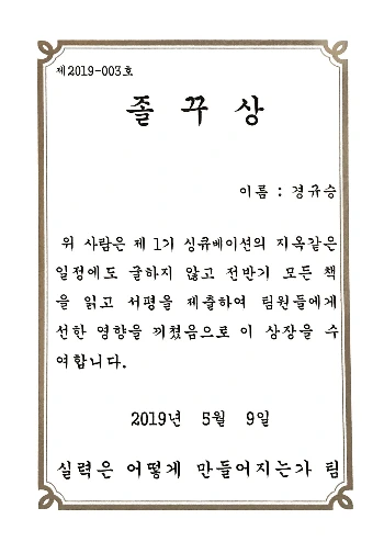 우리 팀의 도연님이 상장을 만들어서 12주의 절반을 해내었다고 졸꾸상을 모든 팀원들에게 주었다. 전혀 생각지도 못한 타이밍에 정성이 들어간 상장을 받으니 너무 기뻤다. 다른 팀원 중 한 분은 회사 책상에 걸어둔 사진을 보내주셨다. 나는 내 책장 앞에 붙여두었다. 행복했다. 절반이 지나가는 동안 큰 일도 있었지만 그런 와중에도 나는 목표한 바를 대부분 달성했다. 그래서 앞으로 다른 스트레스 상황에 직면해도 기존의 습관을 유지할 수 있다는 자신감을 얻었다. 그것이 졸꾸가 우리에게 주는 보상이 아닌가 싶다.