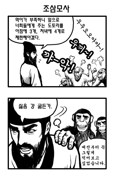 조삼모사(朝三暮四): 아침에는 도토리 3개, 저녁에는 도토리 4개. 간사한 꾀로 남을 속이다.