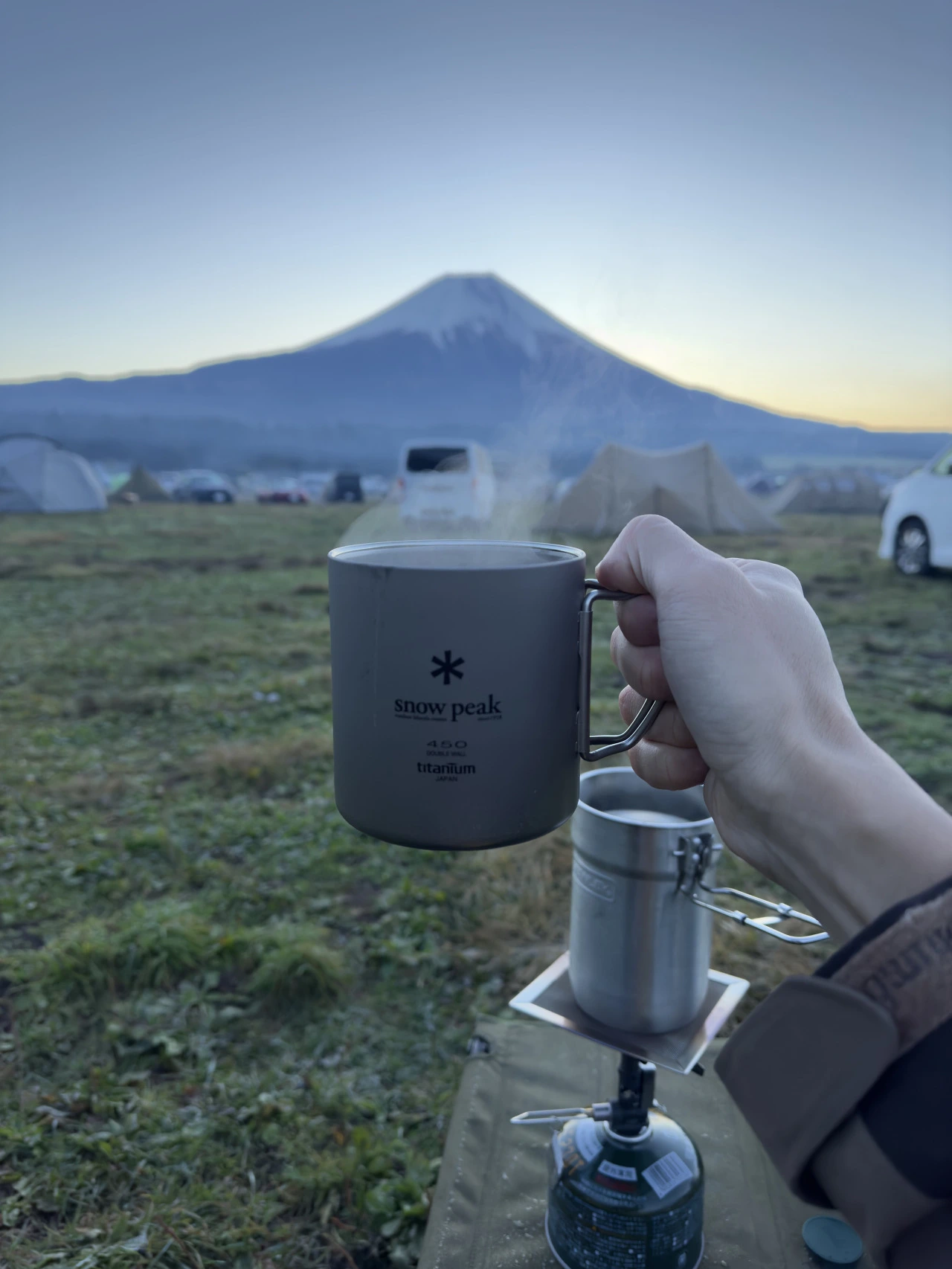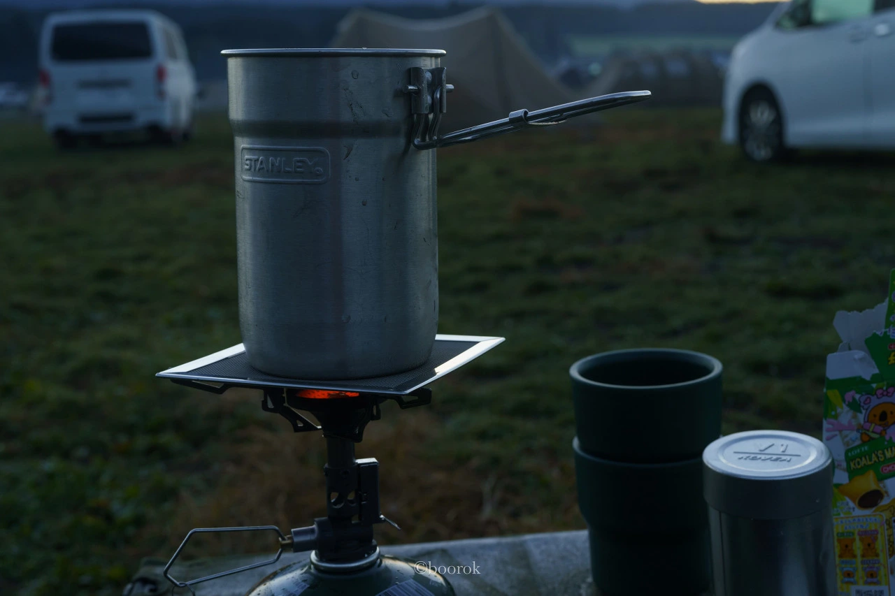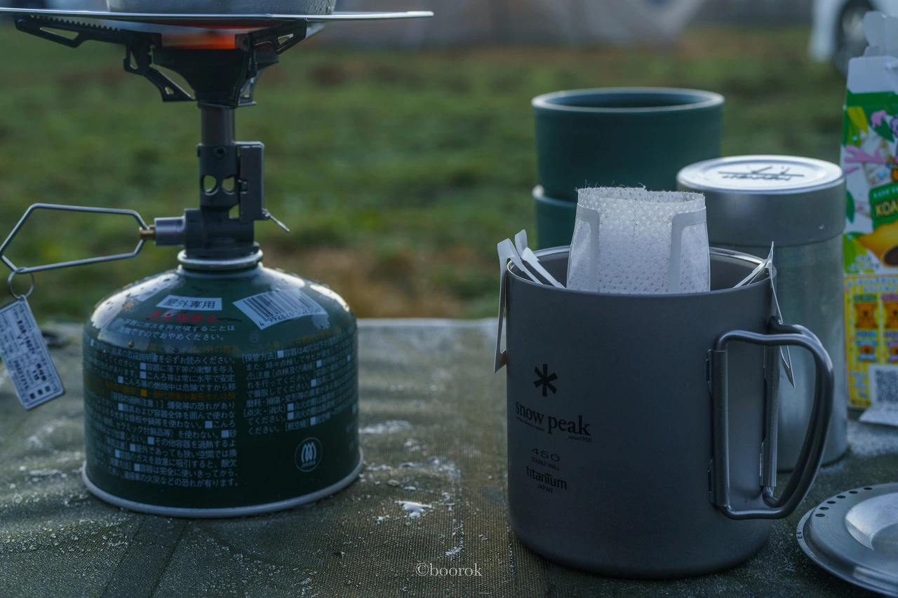 이미 꼬질꼬질한 스탠리 쿠커와 새로 영입한 스노우피크 컵이 수고해주셨다. 커피는 전날 알펜도쿄에서 구매한 드립백으로.