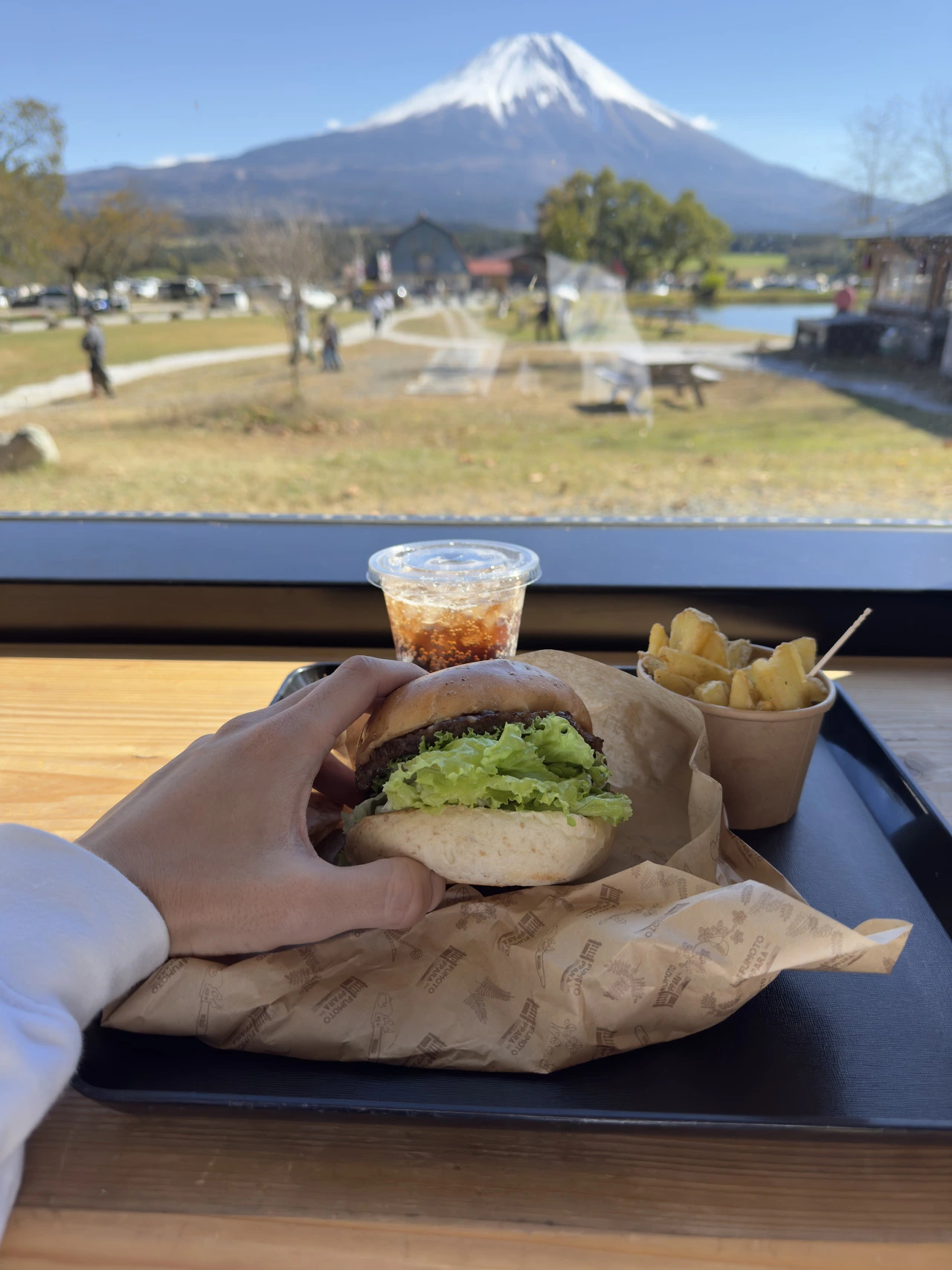 체크아웃 전 어제 먹지 못한 사슴고기버거로 아침식사 해결. (후지산 원툴 아니랬으면서 사진마다 후지산 걸치게 찍는거 보소)