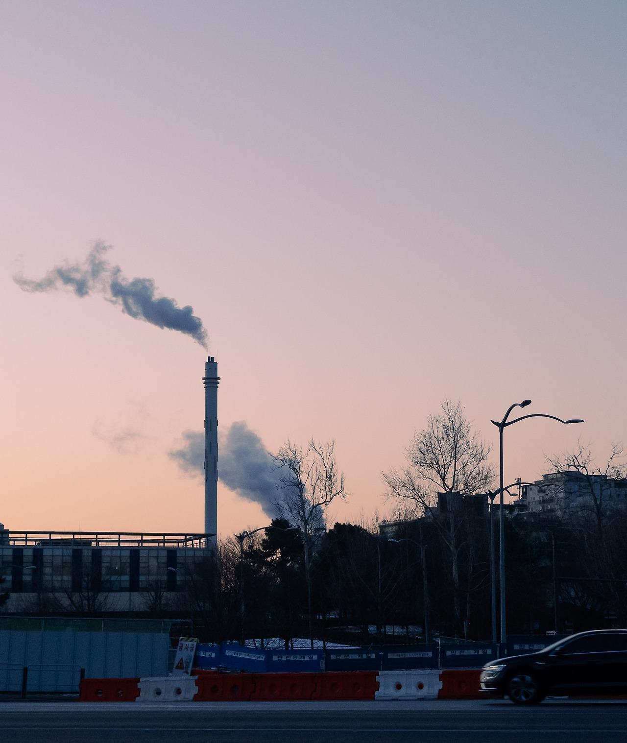 하지만 사진을 찍으려고 보니 평소에 보이지 않던 것들이 보였다. 해질 때와는 다른 동틀 때 하늘의 색감. 겨울이면 더 거침없이 뿜어대는 지역 난방 공사 굴뚝의 김. 전에는 있는 줄도 몰랐던, 한 번 쯤 가보고 싶게 생긴 클라이밍 센터까지.