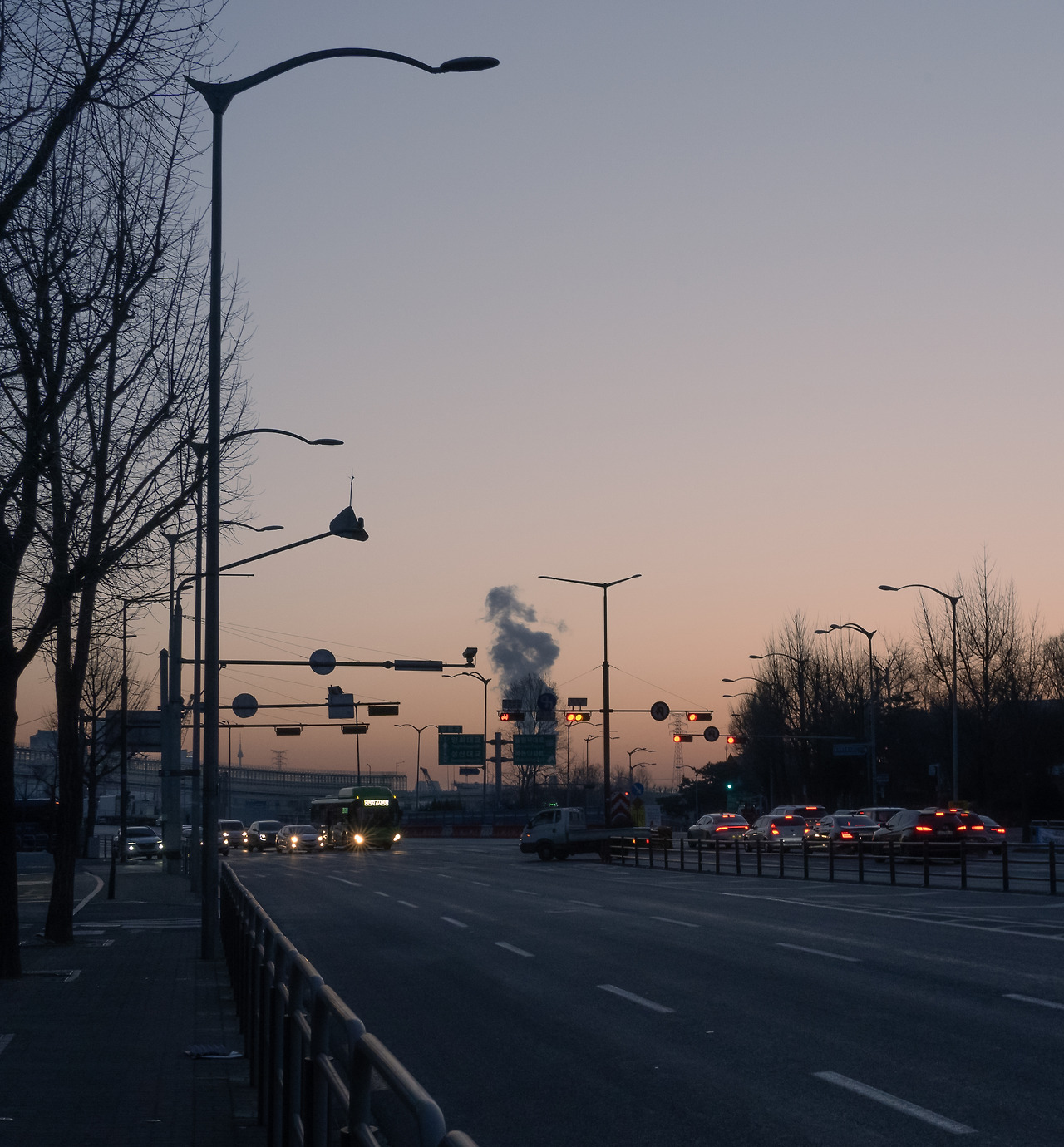 조금 더 새로운 사진을 찍어보고 싶었다. 코로나 때문에 새로운 공간을 찾아 멀리 움직이지 못한다면, 새로운 시간대에 찍어보면 어떨까? 갑자기 그런 생각이 들어 일출 시간에 맞춰 조금 일찍 일어나 카메라를 들고 나왔다. 사실 전날 나가려고 했는데 아침잠의 유혹을 뿌리치지 못하고 실패했다. 이날이 두 번째 도전. 이번에도 안 나가면 다음 주말까지 기다려야 했고, 그때까지 새벽 사진에 대한 열정이 살아있을 것이란 장담을 할 수 없었기에, 무작정 일어나서 눈꼽만 떼고 나왔다. 겨울 아침 7시 30분. 해는 이제 뜨기 시작했지만 거리엔 이미 사람과 차들이 제법 돌아다니고 있었다.
