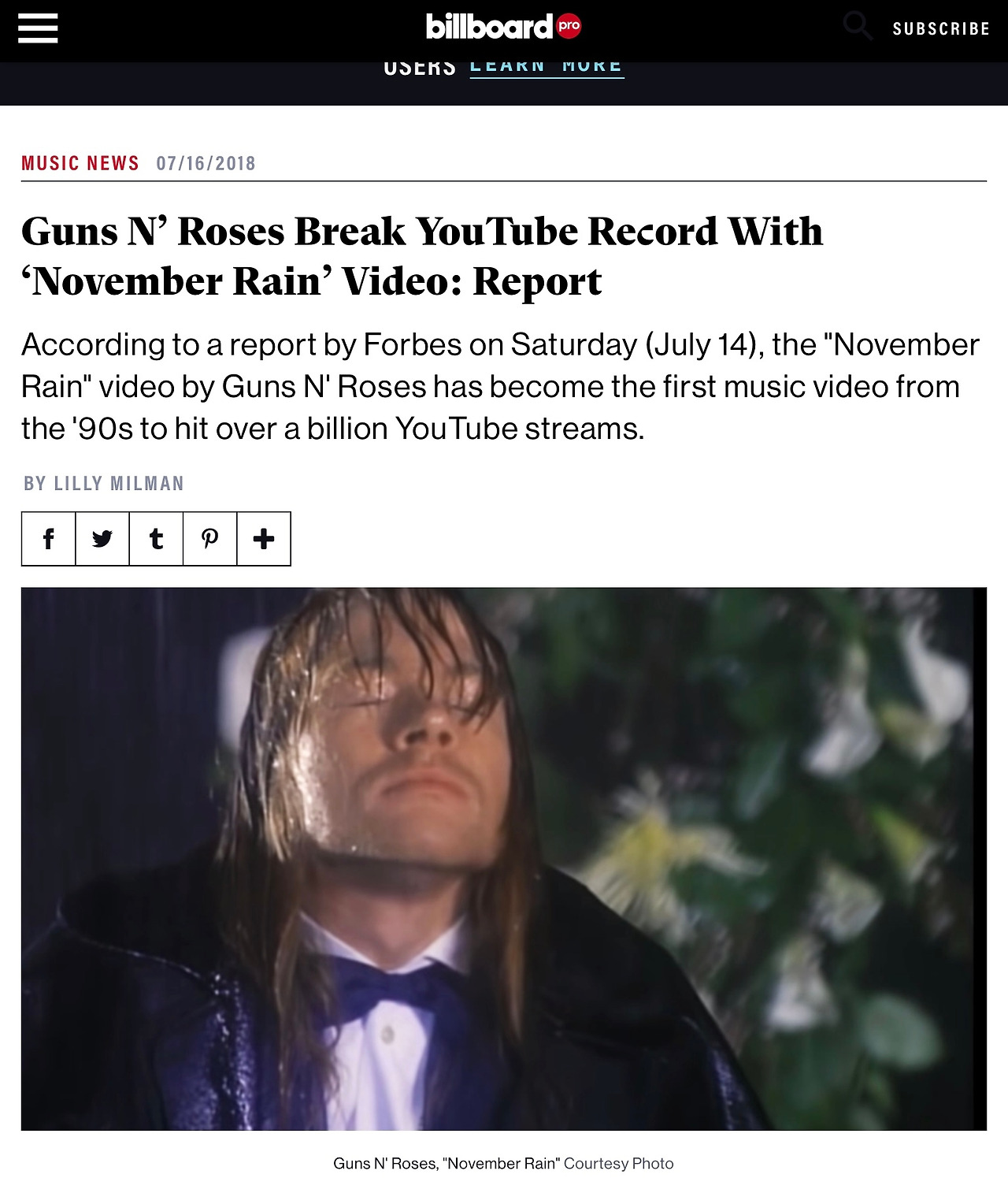 2018년 7월 빌보드는 ‘November Rain’이 90년대 노래 가운데 유튜브 10억 뷰를 달성한 최초의 곡이란 기사를 내보냈다. 저때는 'November Rain' 뮤직비디오가 유튜브에 올라간 지 5년 정도 지난 시점이었는데, 5년이 더 지난 지금은 20억 뷰를 돌파했다. 전 세계서 약 5년에 10억 뷰 정도씩 시청 중이다. 배캠에서 보다는 세계적으로 인기가 있나 보다. ‘November Rain’은 여전히 건재하다.