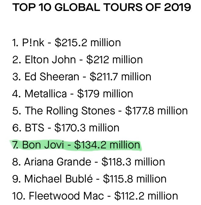 같은 순위에서 6위가 BTS(방탄소년단)인데, 2019년 당시 멤버 전원이 20대였고, 현재진행형의 전성기였던 BTS의 바로 아래에, 35년 차 밴드 본 조비(Bon Jovi)가 자리했었다는 것은 놀랍다. 이제 팬데믹은 거의 종식되었고, 모든 것이 제자리를 찾아가고 있으니, 본 조비(Bon Jovi)의 월드 투어도 다시 기지개를 켜게 될 것이다.