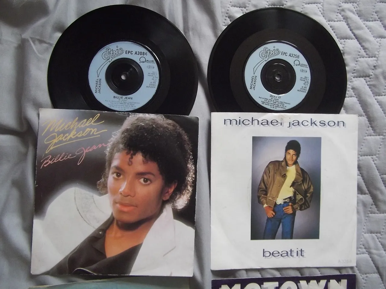 마이클 잭슨의 ‘Thriller’ 12인치 정규 앨범(좌)과 이에 수록된 곡 ‘ Billie Jean’ 과 ‘Beat It’ 7인치 싱글 레코드(우)