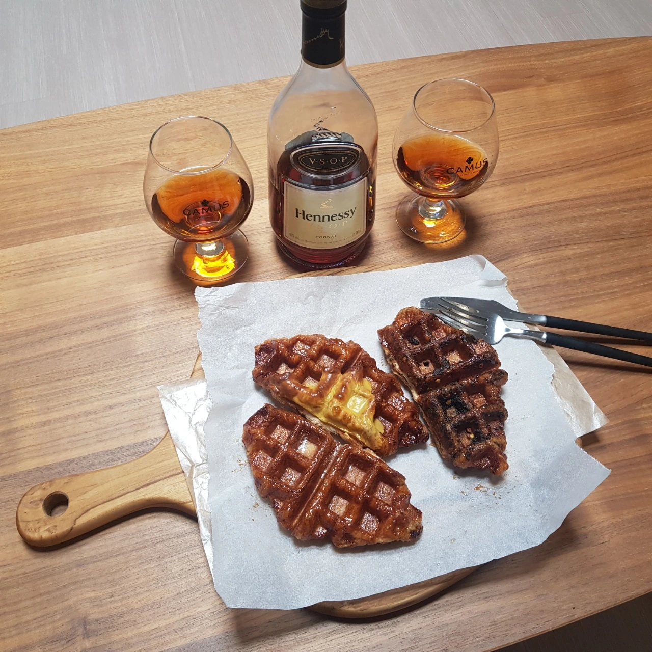 나 또한 기본적인 속성에 초점을 맞춰서 환상의 짝꿍을 찾아냈던 적이 있는데, 바로 크로플과 꼬냑이다. 가로수길에 갔다가 유명한 맛집에서 크로플을 사 왔는데, 짙은 갈색의 반짝이는 외모를 자랑하는 크로플을 보며 왠지 꼬냑과 잘 어울릴 것 같다는 생각이 들었다. '짙은 갈색'이라는 공통점을 이용한 아주 단순하고 모험적인 매칭이었지만, 크로플의 고소하면서도 깊은 단맛이 꼬냑이 숨기고 있는 내면의 캐러멜향을 무대 위로 끌어올려 기막힌 마리아주를 선사했다.