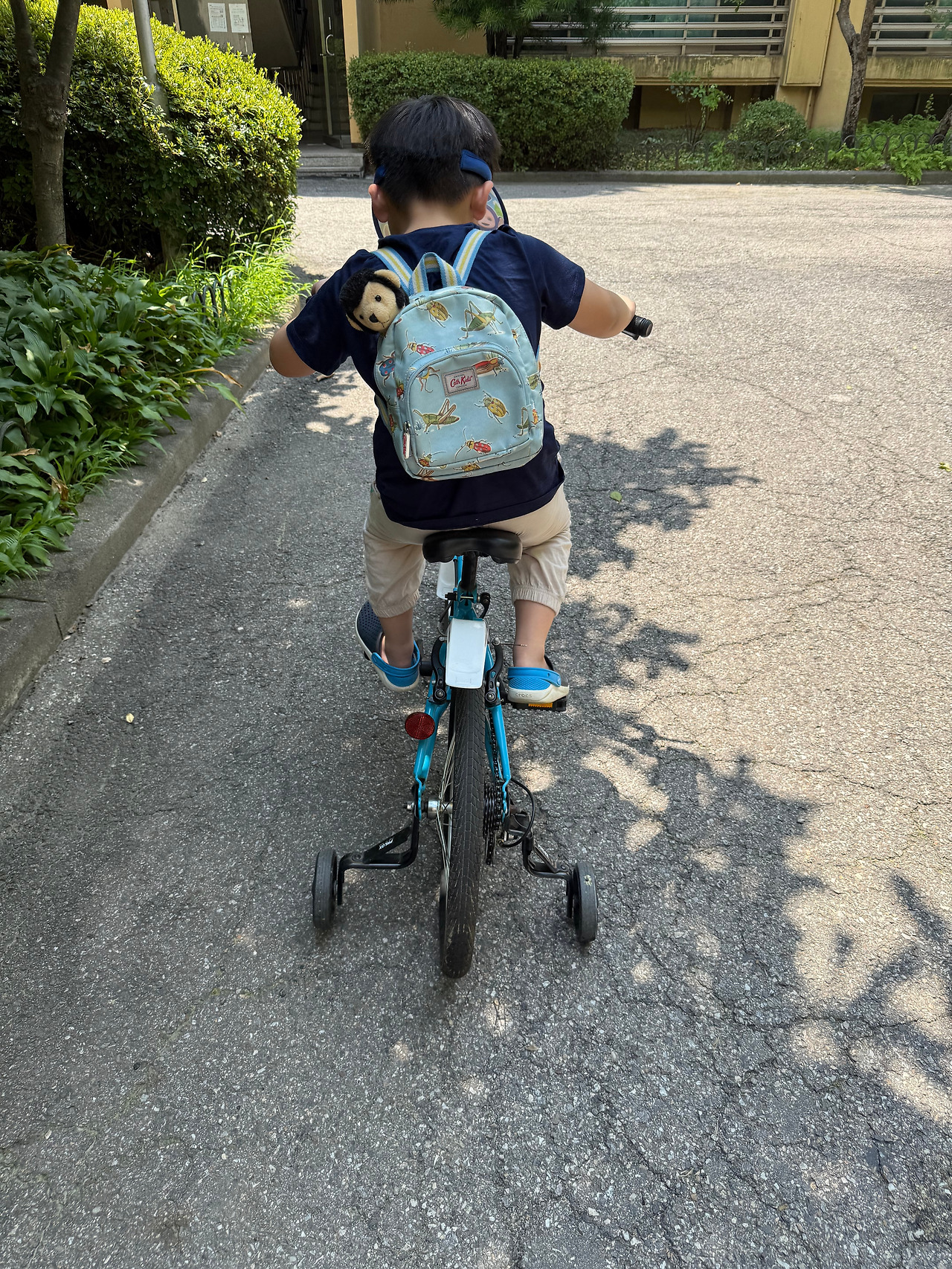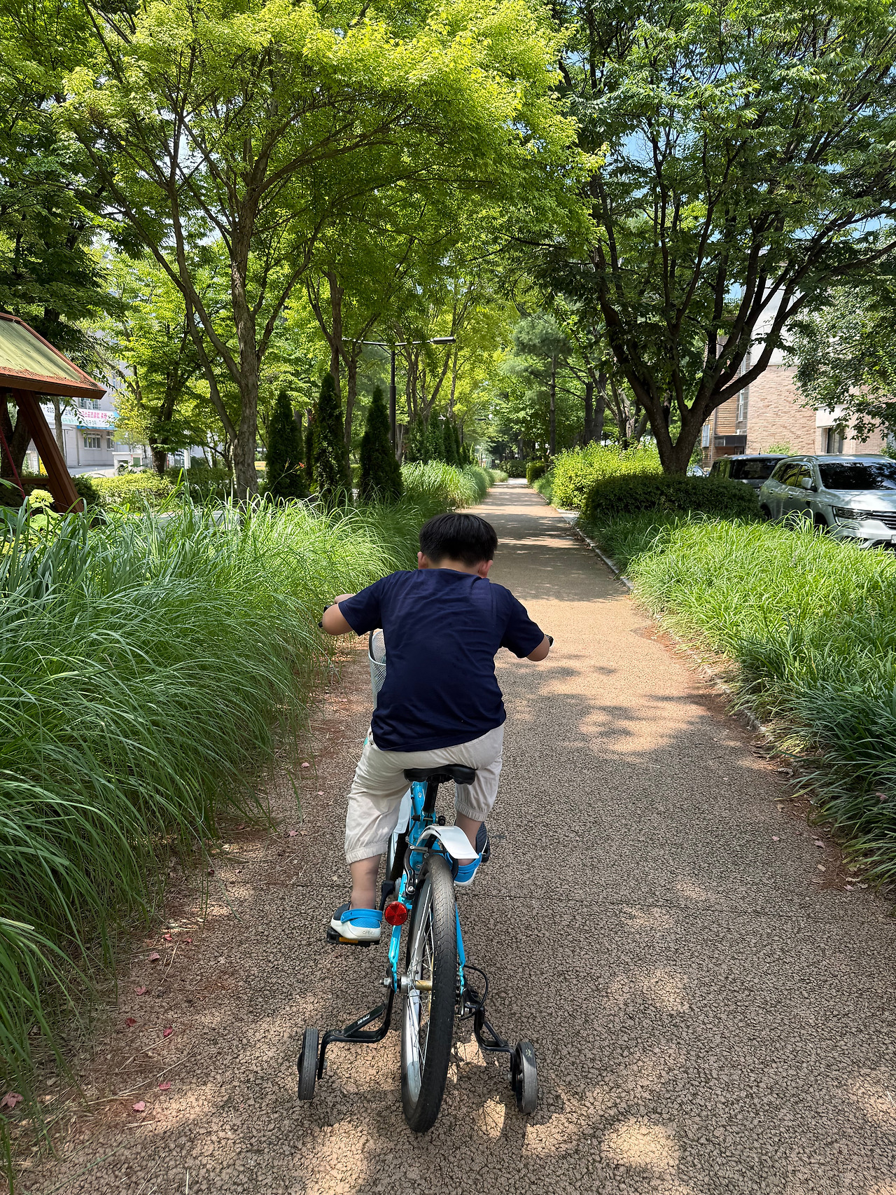 해필이면 해가 중천, 가장 쨍쨍거린다는 12시다. 챙겨 온 물은 10분도 안 돼서 이미 다 마셔버렸고 가만히 있어도 땀이 줄줄, 햇볕을 가리기 위한 모자인데 더워서 자꾸만 모자를 벗어서 연신 부채질을 하고 있다. 아이의 온몸도 땀이 줄줄줄, 등까지 흠뻑 젖었다. 그래도 열심히 페달을 굴리고 공원을 끝까지 한 바퀴 돈다.