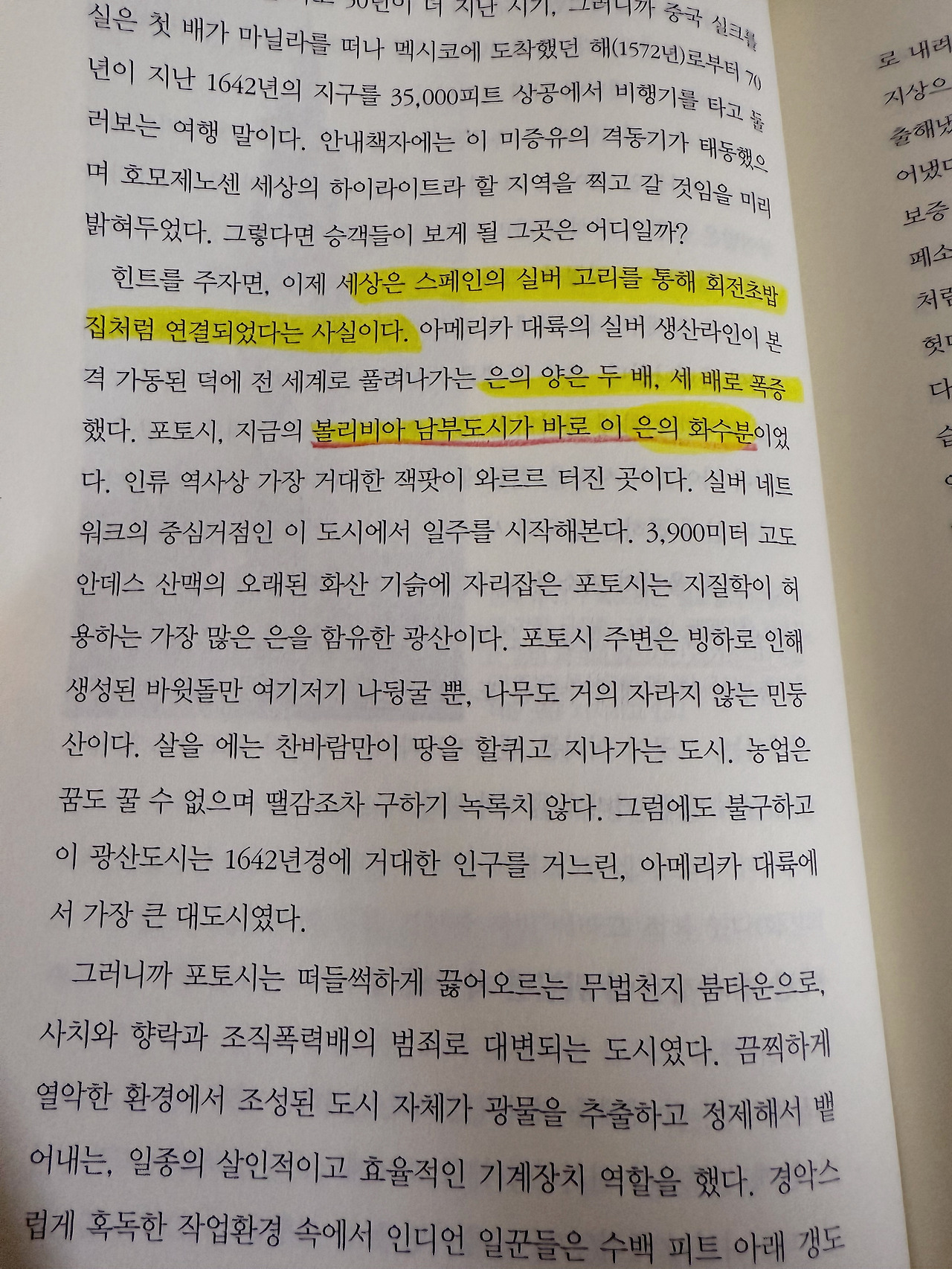 올해 함께 읽은 찰스만의 1493 콜럼버스가 문을 연 호모제노센 세상에도 볼리비아의 '포토시'가 등장한다. 볼리비아 포토시, 세계에서 가장 많은 은을 품고 있는, 16세기 중반 거대한 은광의 발견은 전 세계 은 생산의 절반 이상을 차지할 만큼 막대한 양을 생산했다고 한다. 이렇게 나온 은이 스페인을 비롯한 세계 경제와 은본위제 확립에 영향을 준 이야기까지 이 책에 자세히 나와있었다. 포토시의 은, 엘도라도의 금! 하지만 반짝반짝 빛나는 그 은들은 단 한 번도 볼리비아의 백성과 국민들은 위해 쓰인 적이 없다. 스페인의 종교 전쟁에 다 쓰이고 전부 빼앗기고. 많은 자본을 가졌음에도 마음껏 떵떵거리며 부유하게 살아본 적이 없는 가난한 나라.