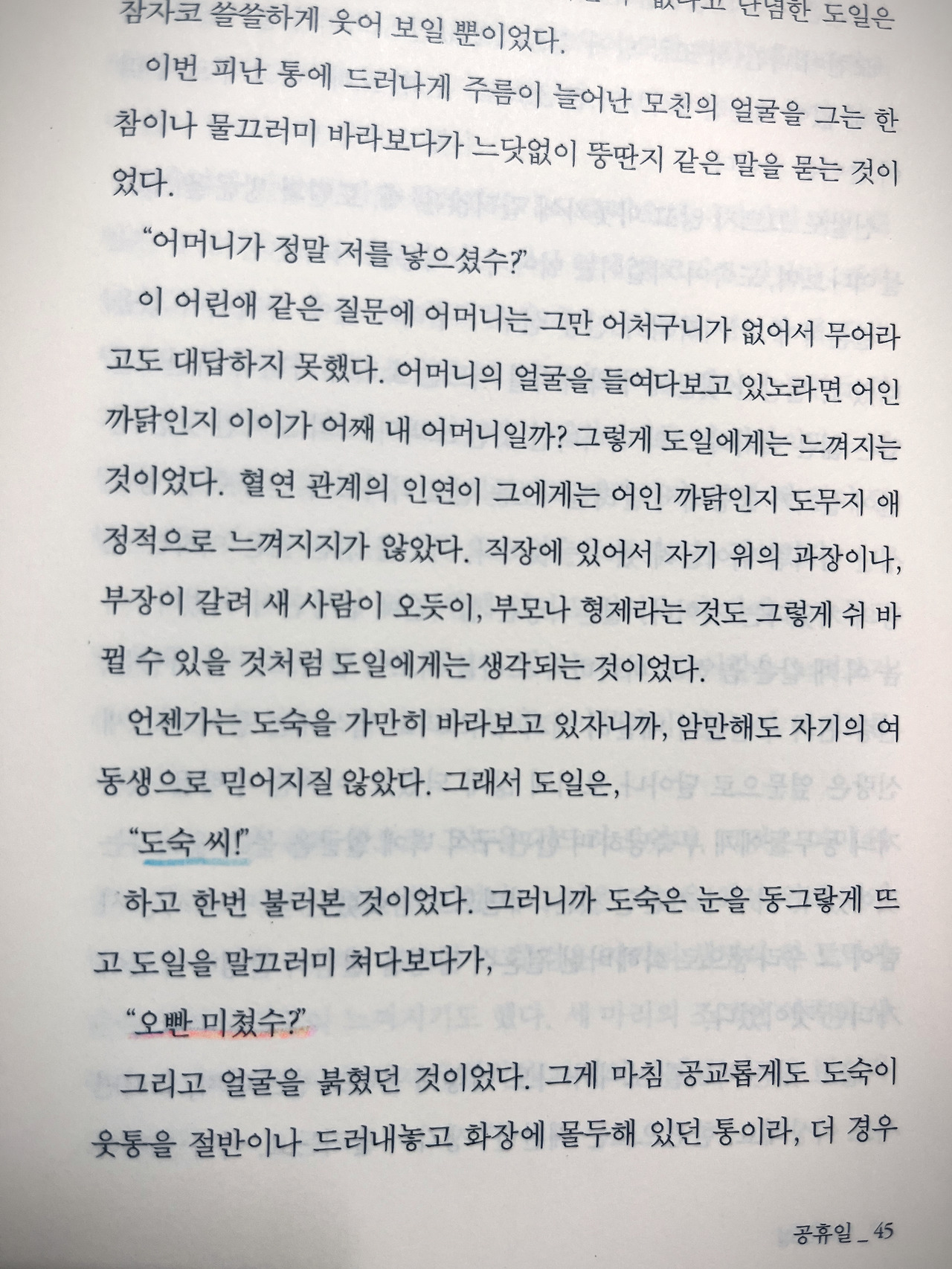 난 계속 햇빛을 찾아 걸어 다닌 건지도 모른다. 그러다 텅 빈 조리원으로 다시 돌아와서 뭘 했냐면, 눈이 퉁퉁 붓도록 울다가 책으로 손을 뻗었다. 사실 이 변화무쌍한 감정을 전부 적고 기록하고 싶었는데 뭔가를 쓰기에도 내 몸이 내 몸 같지 않았기에.(아이를 낳고 나선 실제로 손목이나 관절에 무리 가는 행동은 안 하는 게 좋다.) 미선언니가 놓고 간 두 권의 책을 읽었고 읽다가 처음으로 다시 웃음이 빵 터져서 미친 사람처럼 웃었다.