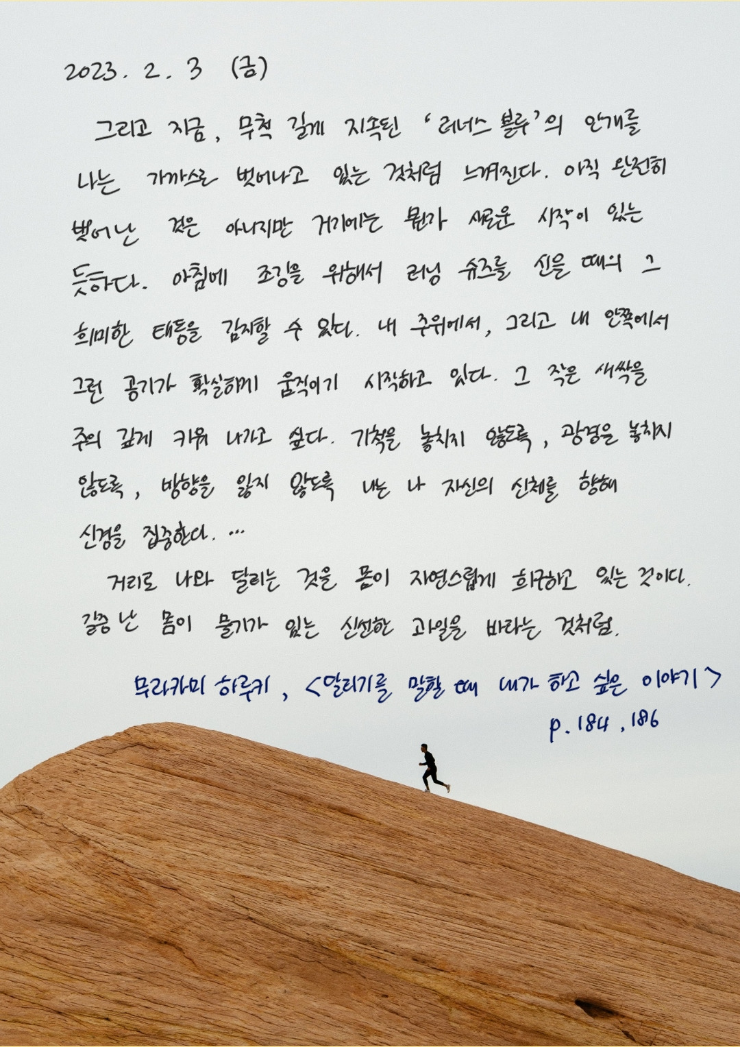 A. 앤나우님, 안녕하세요. 사실 제게는 필사에도 꽤나 큰 에너지가 필요한 일이라는 걸 실제 해보고서야 알았어요. 글자만 옮겨 적는 필사보다는 저는 조금 더 저 다운 방식의 필사방식을 찾아가는 과정이기도 했고요. 제가 그림 그리는 것에는 유독 취약하다 보니 글귀와 어울리는 배경 사진에 쓰는 방식으로요. 제가 지금은 벌려놓은 일들이 있어서 필사모임을 조금 미뤄뒀지만, 필사 경험이 제겐 너무 좋았던 기억이라 꼭 다시 참여해 볼 계획이에요.