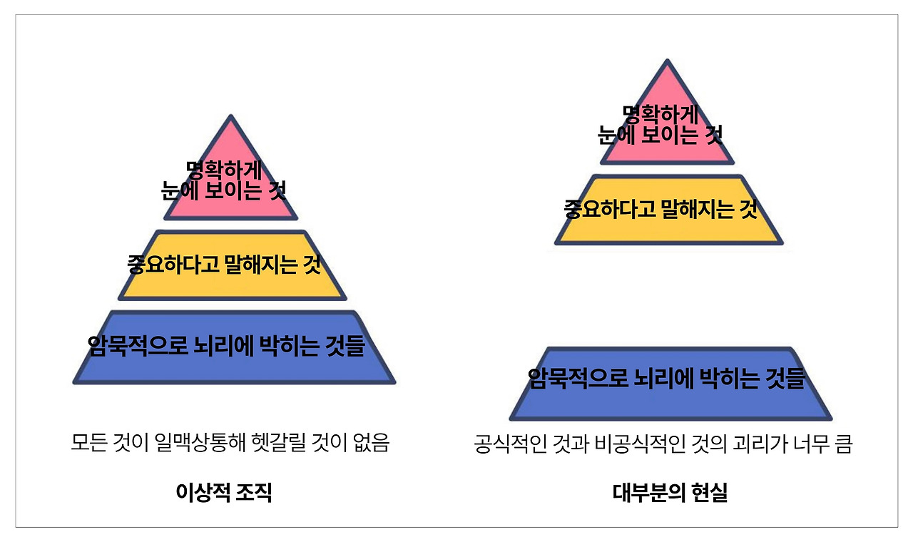 이 세 가지를 잘 기억하면 조직문화라는 게 왜 실체가 있는 듯하면서 없기도 한지를 알 수 있게 된다. 실제로 조직문화가 눈에 보이는 것과 보이지 않는 것의 집합체이기 때문이다. 한 큐에 설명하기가 어려운, '대충 어떤 분위기인지 알겠지?'의 영역.