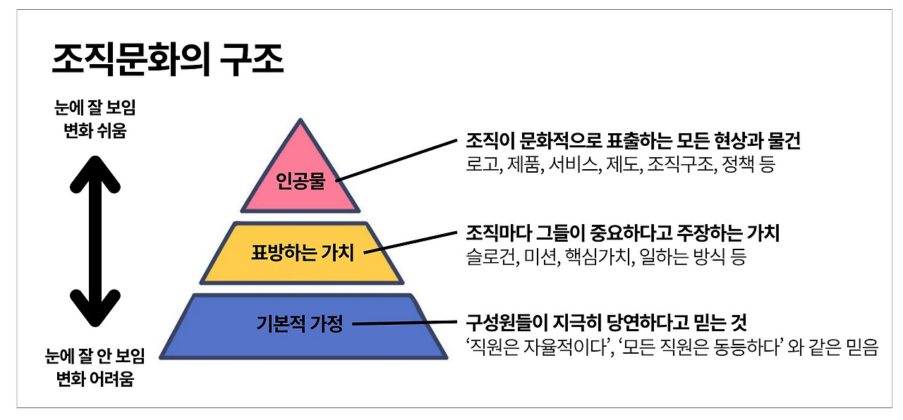 정말 그렇다. 사실 이보다 더 복잡하겠지만 공통적으로 관찰되는 현상을 구조화해서 이름 붙인 이론이 있기에 그나마 심플하게 받아들일 수 있다. 이 글에서는 애드거 샤인의 조직문화 구조 이론을 참고했다.