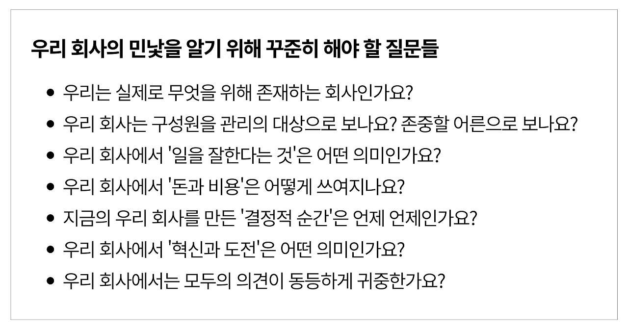그럼에도 불구하고 더 나아지는 길을 찾고 싶다면 우리 회사를 지배하고 있는 '기본적 가정'이 무엇인지 캐치하고 꾸준히 많이 이야기해야 한다. 그 이야기를 하는 주체가 되기 위해 필요한 자격이 있는 것은 아니니, 누구든 이 이야기를 꺼내볼 수 있다. 물론 조직문화를 담당하는 부서가 있다면 그 부서원들이 가장 열심히 이 대화를 이끌어야 할 것이고, 그보다는 경영진이 이 대화에 가장 기민하게 동참해야 한다. 김성준 교수님의 <조직문화 통찰> 책에 따르면 우리 회사의 조직문화를 보는 눈을 키우려면 '기본적 가정'을 계속해서 탐구해야 한다고 한다. 이 탐구를 위해 우리가 이야기해 볼 수 있는 것들. 어려운 단어들은 거둬내고 기업의 실무자로 일한 10년의 경험을 녹여 중요한 질문들을 선별해 보면 아래 정도이다.