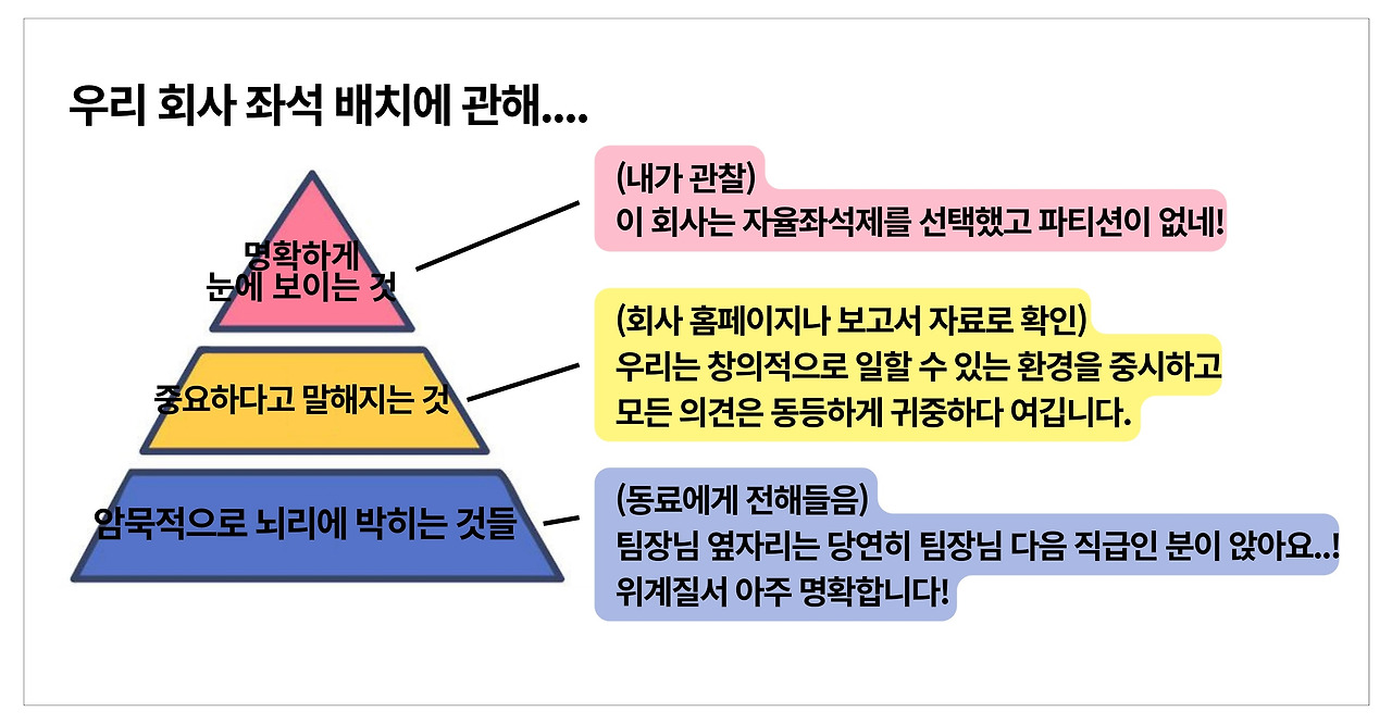 이 상황에서 결국 나의 내면 깊숙한 곳에 쌓여 가장 오래가는 건, ‘자율좌석제는 다 필요 없고 눈치껏 잘 행동해서 팀장님 옆자리에 안 앉아야 한다 ‘는 암묵지이다.