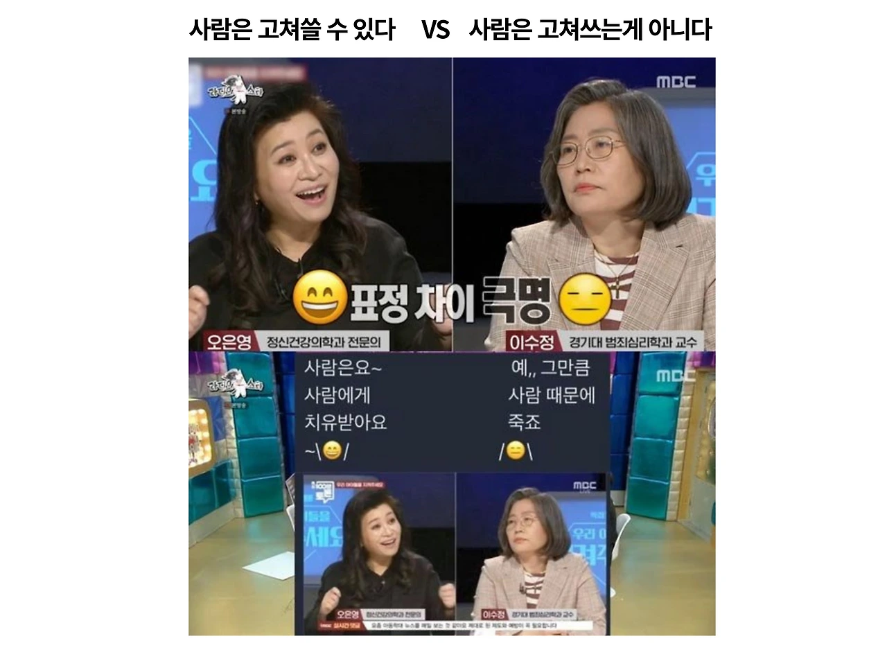 <우리 아이들을 지켜주세요> 라는 주제로 100분 토론에 출연한 오은영 박사님과 이수정 교수님의 가치관 대충돌이었다. 사람을 고쳐쓸 수 있다는 자와, 사람은 고쳐 쓰는 게 아니라는 자의 막강한 대립.