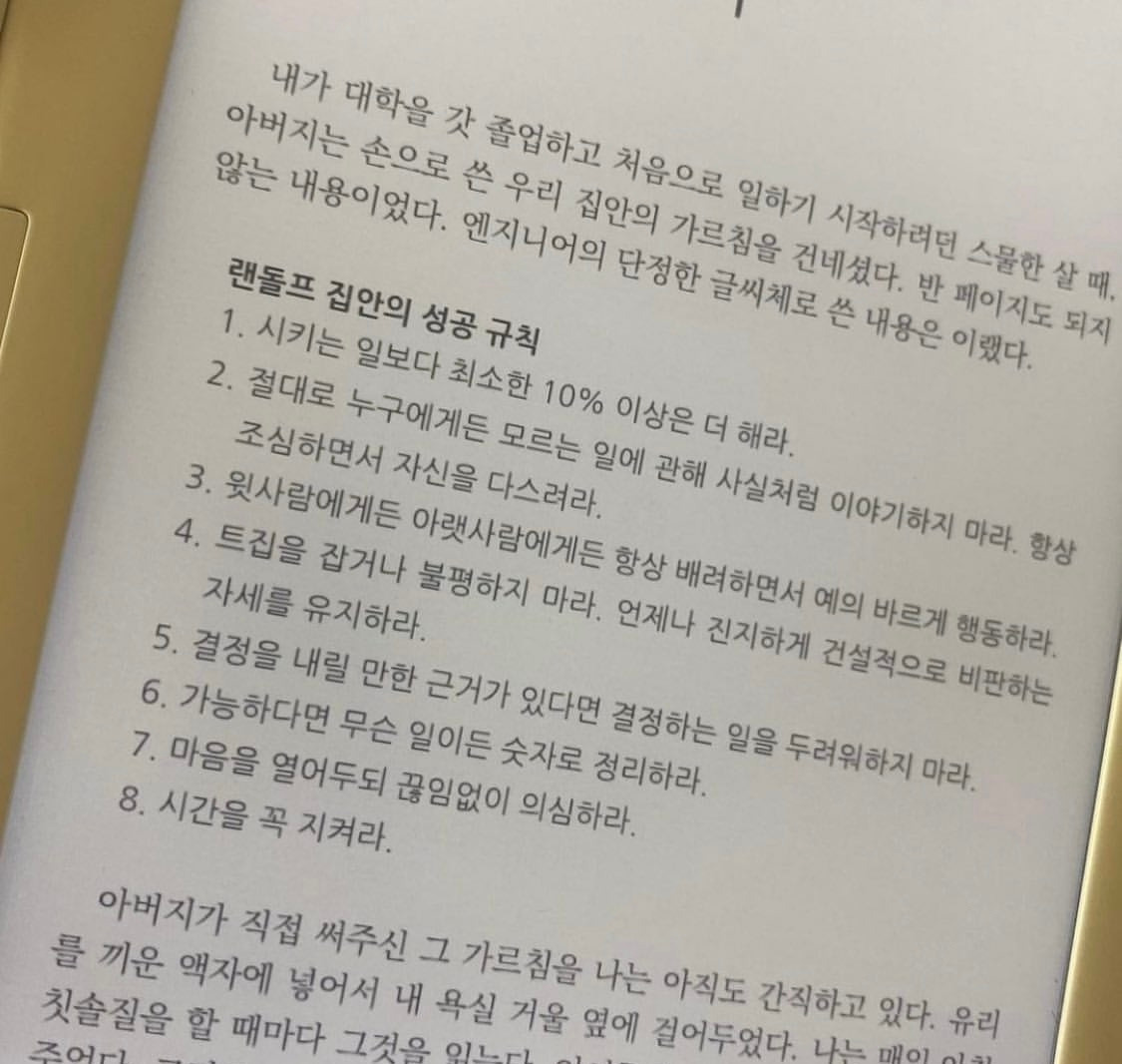 회사 차원의 일이니 나와는 거리가 멀다고 생각하지는 않았으면 좋겠다. 회사에서 나서주지 않으면, 우리 팀의 것을 정하는 것만으로도 아주 유의미하다. 만약 내가 1인 프리랜서라면 나에게 스스로 위 질문들을 던져 '나의 그라운드룰'을 만들어볼 수 있다. (마치 '나 사용 설명서'처럼). 내가 '근로소득' 없이 가정을 책임지고 있다면? 우리 집안의 것을 만들어도 좋다. 실제로 내가 접한 <그라운드룰> 중 가장 오래 기억에 남아있는 건 넷플릭스 공동창업자 마크 랜돌프가 소개한 [랜돌프 집안의 성공 규칙]이었다.