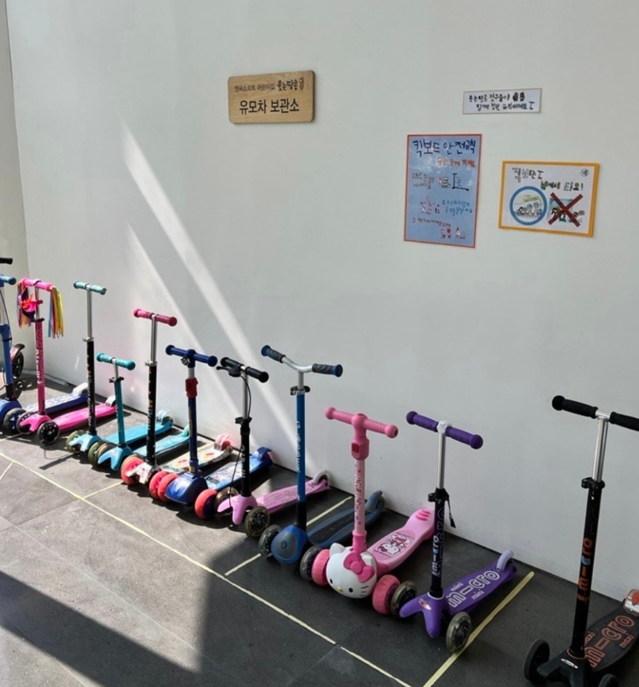 그리고 안내문 아래에 칼 각으로 주차된 킥보드들이 귀여워서 기분이 절로 좋아졌었다.