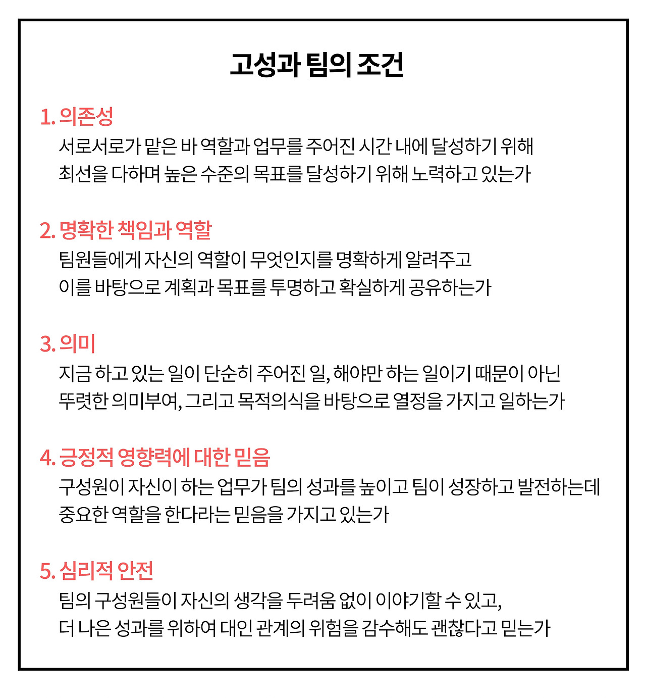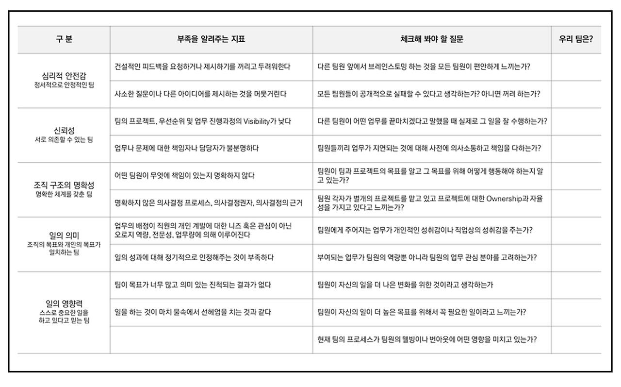 구글에서 찾아낸 고성과 팀의 조건을 체크해 볼 수 있는 가이드도 있고(아래 이미지)