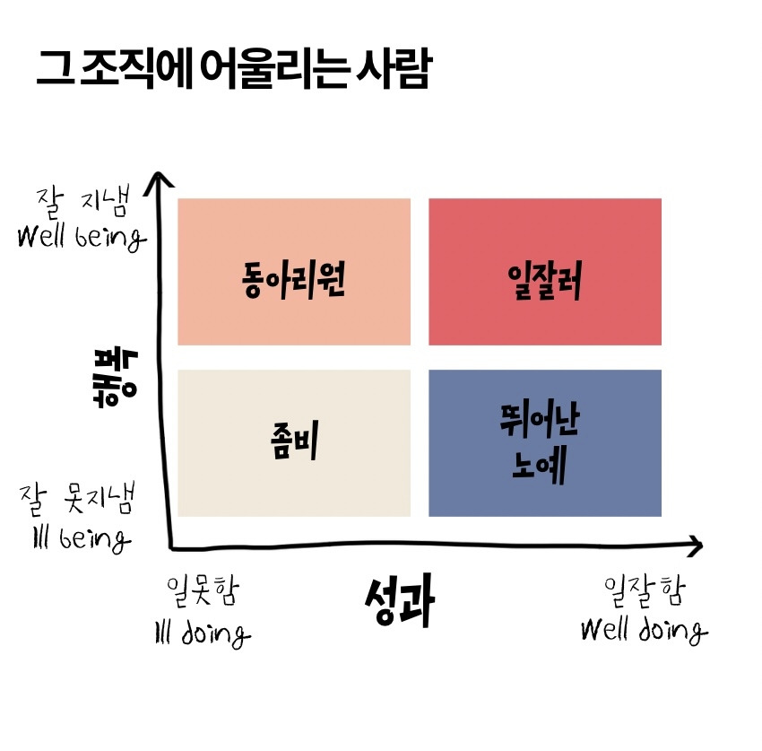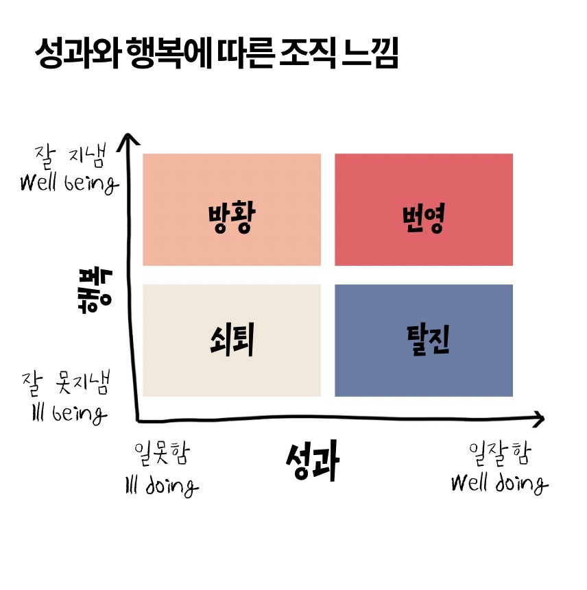 우리 팀은 어느 사분면에 있는지, 이 팀에 머물고 싶어 하는 구성원이 어떤 유형의 사람인지 한 번만 생각해 보면 조직에서의 행복이 왜 중요한 지 아주 쉽게 알게 된다.