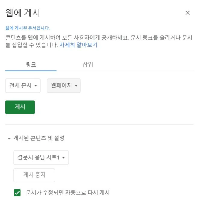 2. 해당 시트를 선택한 다음 문서 타입을 쉼표로 구분된 값(.CSV)형식으로 설정하고 [게시] 버튼을 누르면 링크가 생성됩니다.