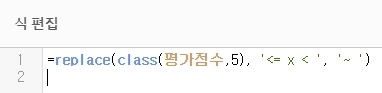 replace 함수를 이용하여 '<=x<'로 표시되는 점수 간 범위를 '~'로 표시되게 합니다.