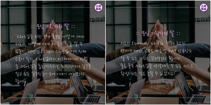 액셀러레이터 기관에서 일했던 시절 나 역시 이 비슷한 업무를 하는 실무진들과의 네트워킹이 있으면 좋겠다, 싶었지만 다른 업무들에 치여 엄두를 내지 못했던 게 사실이었다. 그래서 이번에 스여일삶을 통해 같은 고민을 하는 이 분들의 소통의 장을 마련해보아야겠다!라고 생각하고 드디어 그 판을 깔아 보았다.