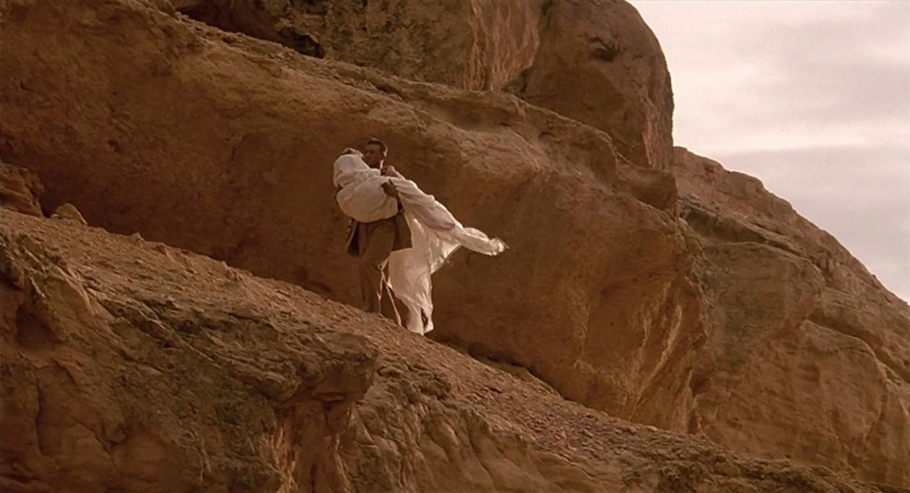 웨딩드레스처럼 하얀 천을 흩날리며 죽은 <아내>를 안고 걸어 나오는 <알마시>의 모습은 이 영화에서 가장 아름다운 장면이다. 해지면 사라져버릴 사막의 그림자처럼, 알 수 없는 언어로 나지막이 울리는 모르는 나라의 자장가처럼... 그는 모래 속으로 사라져간다.