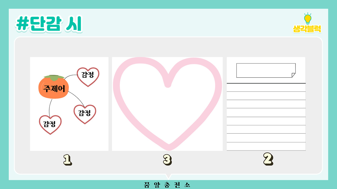 3T 단감 시 액자 활동에서는 2T 단감 활동에서 떠올린 주제 단어와 감정을 연결해서 문장으로 만드는 활동