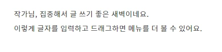 글을 쓰려고 글쓰기 메뉴에 들어가니, 집중해서 글 쓰기 좋은 새벽이라고 나를 반겨준다. 우선 제목을 정하고 글을 써 내려간다. 기승전결을 갖추지 않고 일기를 쓰듯 써 본다. 이런 게 콘텐츠로서 가치가 있나, 싶지만 일단 써 본다. 만약 여러분이 이 글을 보고 있다면, 브런치 작가 선정 팀에서 나 같은 대학생이 새벽에 적은 이런 글 조차도 브런치에 걸릴 자격이 있다고 판단했다고 생각하면 된다. 이번 글은 누구나 브런치에 도전하세요!라는 정도의 메시지를 담고 있다고 보면 된다.