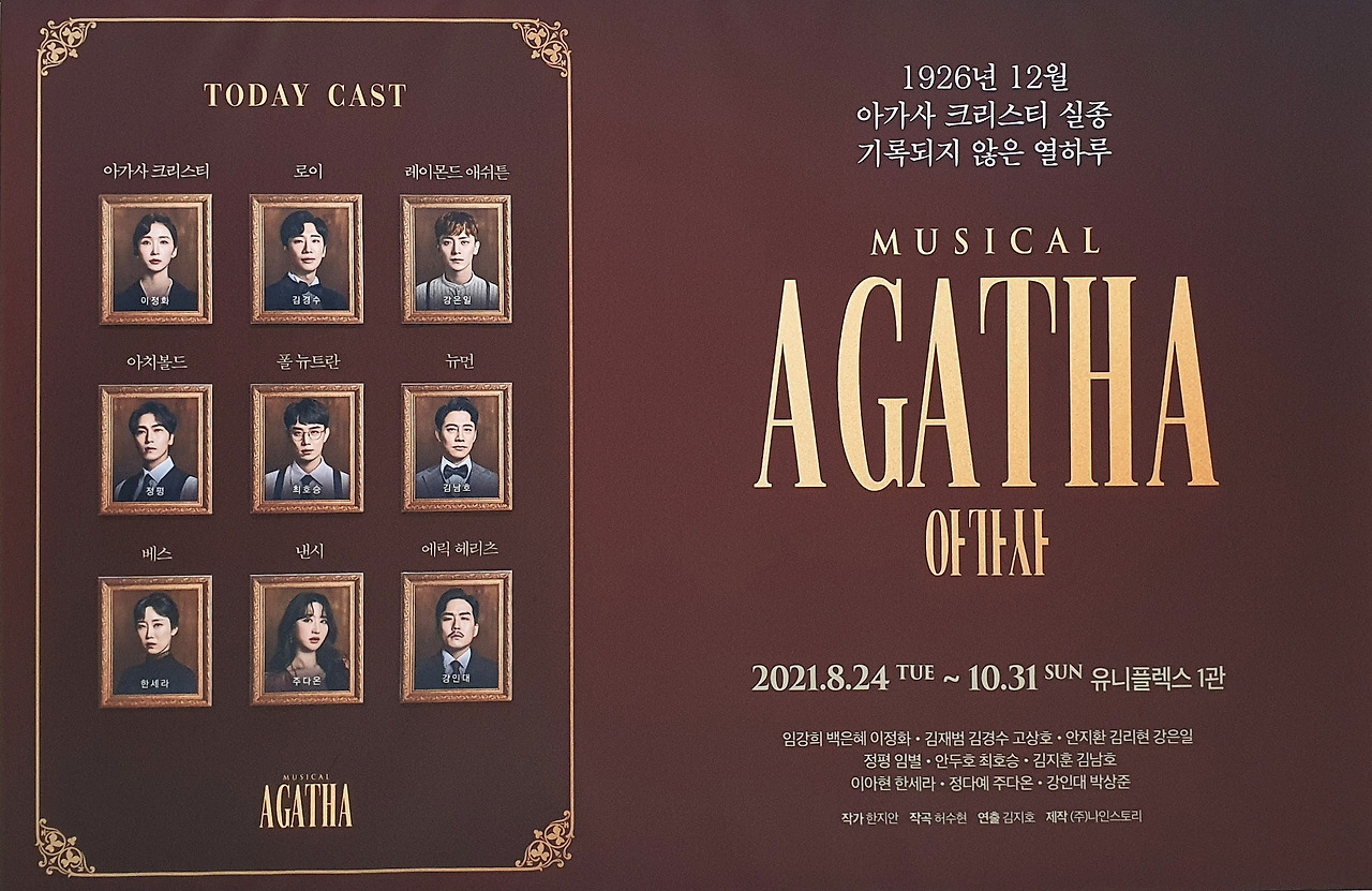 뮤지컬 <아가사>는 아가사 크리스티라는 사람과 그 작품을 잘 녹여낸 작품이었다. 인물의 관계는 <오리엔트 특급살인>을 떠올리게 하고, 작품의 반전은 <애크로이드 살인사건>의 서술트릭을 연상하게 한다. 글을 정말 잘 쓰는 사람은 직접 경험해보지 않고도 상상만으로 잘 쓴다던 아가사의 말에, 안락의자에 앉아 머리를 굴리는 것만으로 사건을 풀어내던 미스 마플을 상상해본다. 아가사가 실제로 실종됐던 시기에 냈던 신문 광고를 조수 레이몬드가 쓴 소설과 관련시켜 그에게만 보내는 비밀 메시지라는 설정으로 녹여낸 건 정말 탁월하다는 생각이 들었다. 실화의 서사의 빈 공간들을 상상력이 적재적소에 잘 파고든 듯하다.
