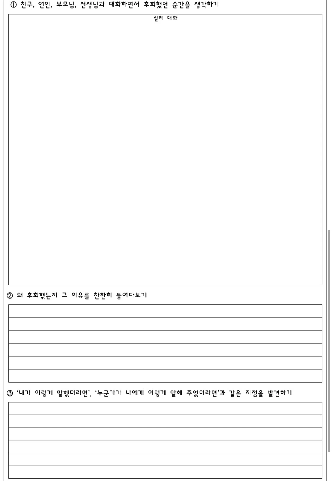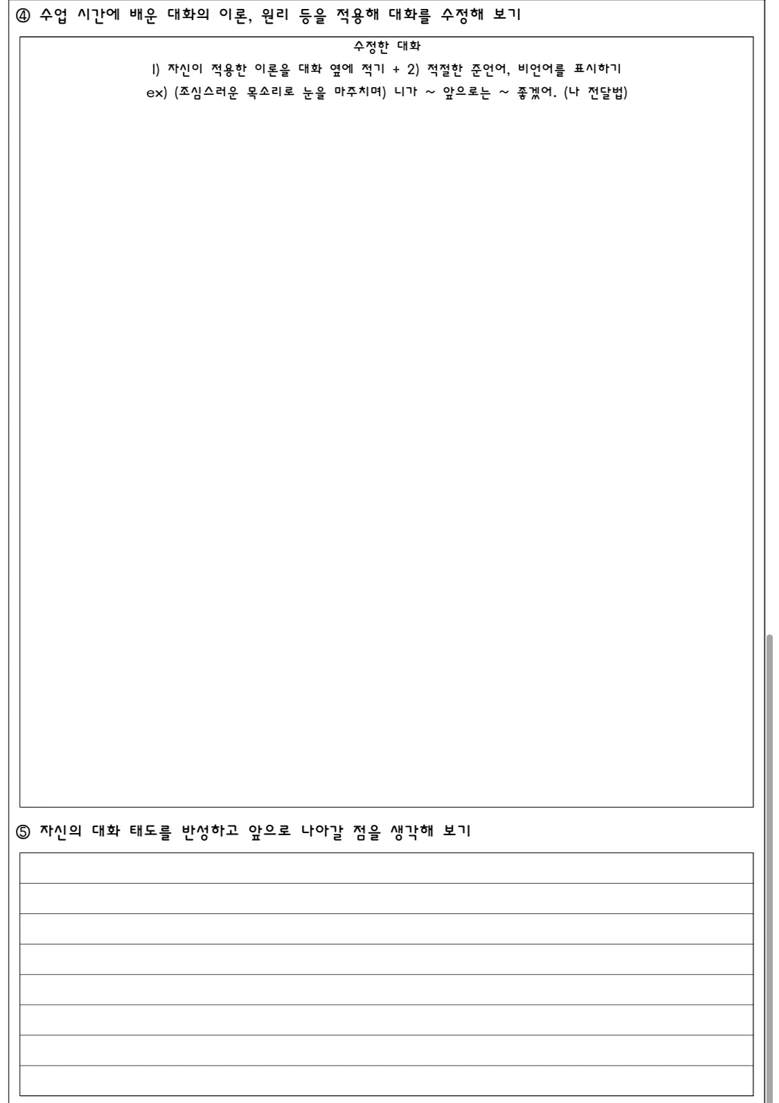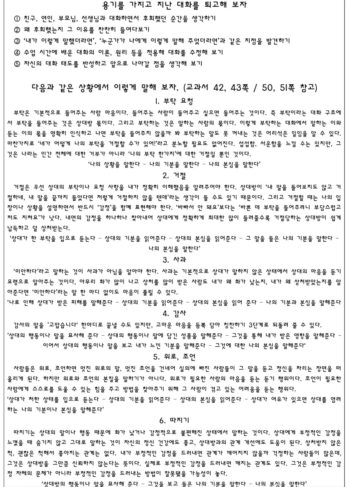 - ‘마지막으로 우리의 평소 대화 태도를 반성해 보자. 그리고 앞으로 어떤 방식으로 대화할 건지 고민해 보자.’