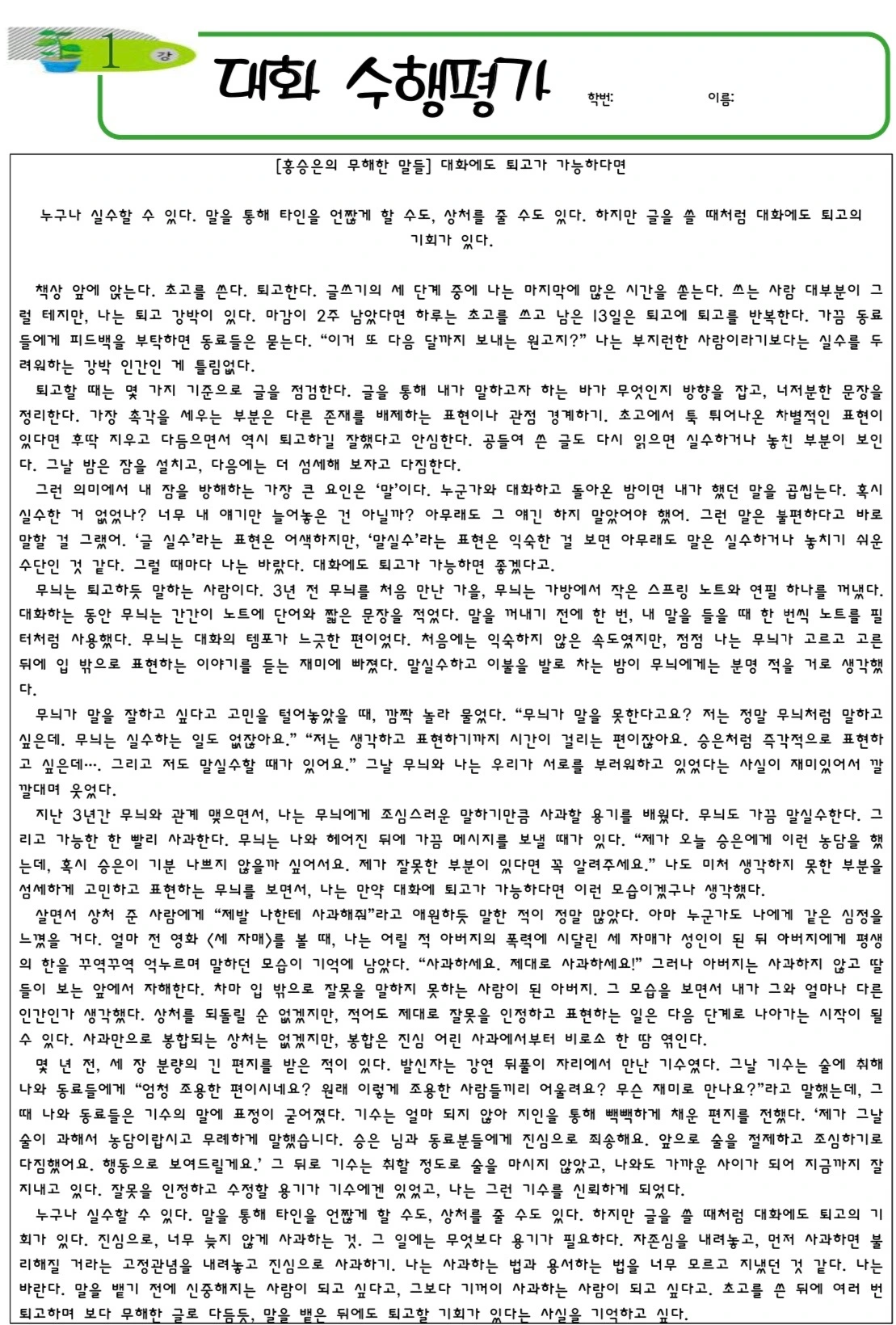 우선 학생들과 과거의 대화 방식을 성찰할 수 있는 한 편의 글을 천천히 읽었다. (홍승은의 무해한 말들 ‘대화에도 퇴고가 가능하다면’) 그리고 마음에 드는 문장에 밑줄을 긋고 이유를 나누는 시간을 가졌다. 그리고 내가 제일 인상 깊다고 생각한 문장을 골라 그 이유를 소개했다. 그 문장은 바로 ‘그 일에는 무엇보다 용기가 필요하다.’였다. 용기가 없어서, 자존심이 상해서, 지는 게 싫어서 사과하지 못했던 과거의 내가 생각났기 때문이다. 그래서 이 수행평가의 제목은 ‘용기를 가지고 지난 대화를 퇴고하기’가 되었다.