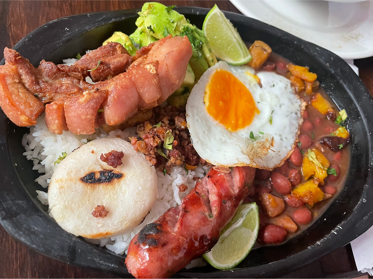 콜롬비아에서는 이 단백질 (소, 돼지, 닭)과 탄수화물 (감자, 밥, 아레파, 파타콘)들을 오늘의 정식 Menu del dia의 형태로 많이 먹는다. 콜롬비아의 (관광객용 식당이 아닌) 일반 식당에서는 오늘의 정식을 대부분 판매한다. 수프, 단백질이 포함된 메인메뉴, 밥/감자/아레파/파타콘 등의 탄수화물, 샐러드, 후식(혹은 주스)으로 구성되어 있는 경우가 대부분이다. 다른 메뉴도 다 같이 판매하면서 오늘의 정식을 다른 메뉴보다 저렴하게 파는 방식인 가게도 있고 오늘의 정식 한 메뉴만 파는 가게도 있다. 이런 가게는 메인메뉴만 닭/돼지/소/생선 등 여러 가지 중에서 1택이고 그 외 수프나 밥, 샐러드, 주스 등은 매일 바뀌지만 선택지는 없는 방식이다. 어딜 가든 수프는 대부분 치킨스톡의 맛이 강하게 느껴지고(맛없다는 뜻은 아니다.), 메인메뉴/탄수화물/샐러드는 한 접시에 내어진다. 메인메뉴, 그러니까 단백질의 양은 약간 적다. 맛있게 먹고 싶을 때는 좀 부족할 수 있지만 일반적으로 한 끼 배를 채울 때는 딱 적당한 정도의 양이다. 일반적으로 5천 원 정도에 먹을 수 있는 저렴한 한 끼다. 콜롬비아의 백반 같다고나 할까.