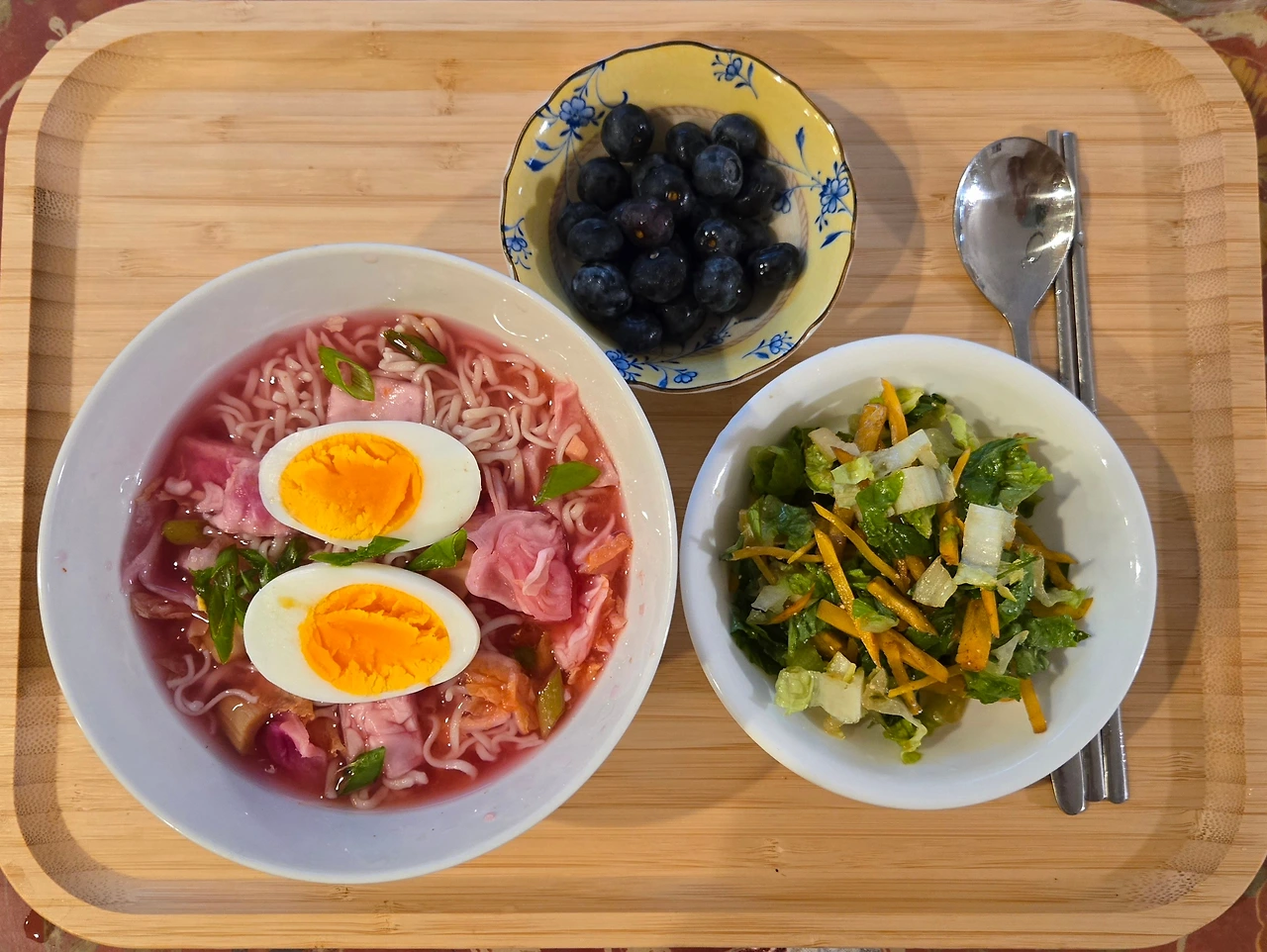 나박김치와 쌀라면이 만난 맛은 어떨까 궁금해하면서 블루베리랑 샐러드 한 접시 같이 차렸다. 블루베리 먼저 먹고 샐러드를 먹었다. 로메인 상추 채 썰고 생고구마 채 썬 것에 올리브유와 레몬즙 뿌리고 코코넛 아미노스로 간 맞춘 샐러드가 입맛을 돋운다. 드디어 나박김치와 쌀라면의 생소한 조합을 맛볼 차례다. 국물 먼저 한 숟가락 입에 떠 넣었다. 새콤하게 잘 익은 핑크빛 나박김치 맛이 환상적이다. 쌀라면 한 젓가락을 입에 넣었다. 오돌오돌하게 씹히는 식감에 국물맛과 잘 어우러져 입안을 감싼다. 내 입맛엔 아주 좋다. 여름에 얼음 넣고 먹으면 냉면에 버금가는 이런 별미가 없을 것 같다. 단 것을 즐긴다면 매실청 헌 숟가락 넣어 주어도 좋겠다. 난 나박김치 맛 만으로도 만족스럽게 먹었다. 나박김치를 담글 때 홍시 하나를 넣었더니 다른 단맛은 필요가 없다.