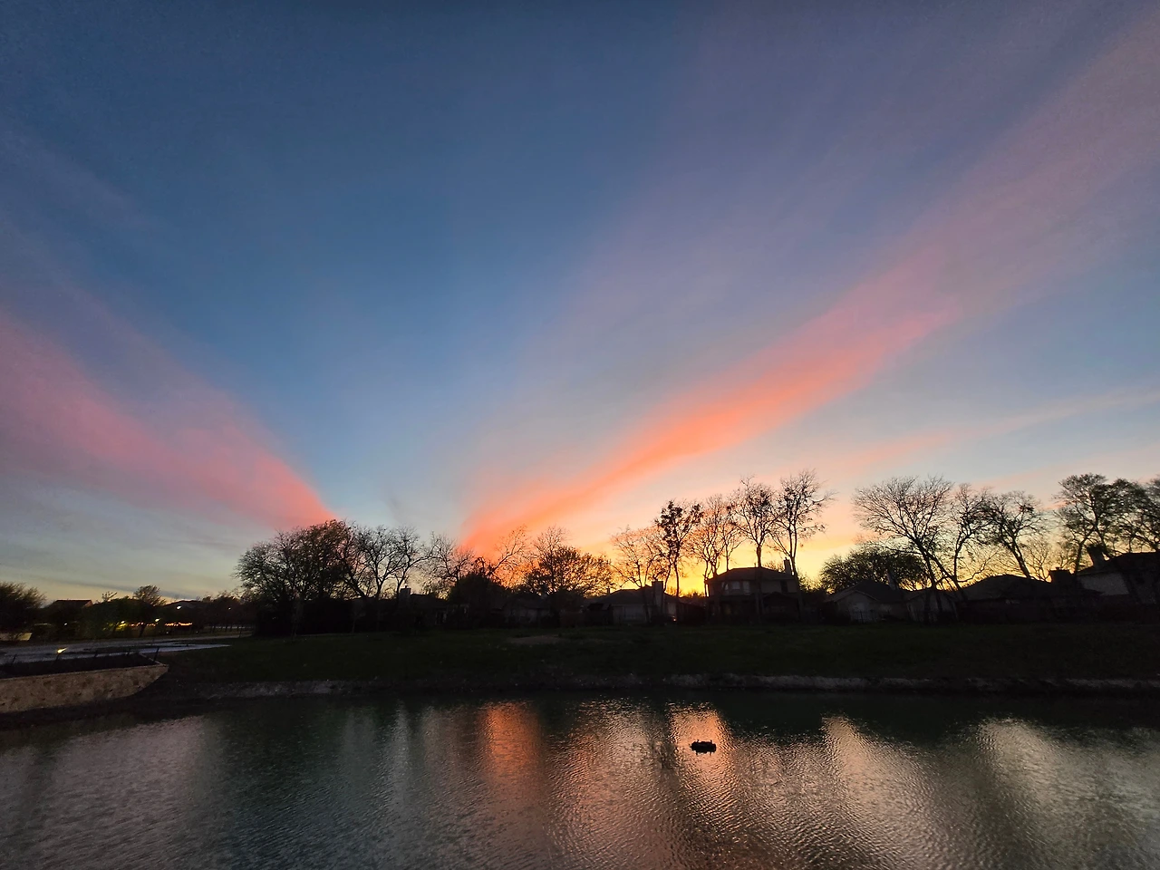 어제 저녁, 그곳에서 마주한 노을은 차마 말로 다할 수 없는 신비였다. 나지막한 주택가의 지붕들과 그 위로 가지를 뻗은 나무들이 노을빛에 젖어 검은 실루엣으로 변해갈 때, 하늘은 가장 화려한 붉은 옷으로 갈아입기 시작했다. 그 강렬한 붉은 기운이 공원의 호수 위로 툭, 하고 떨어져 내리는데, 수면은 이내 거대한 거울이 되어 하늘의 함성을 그대로 받아냈다.