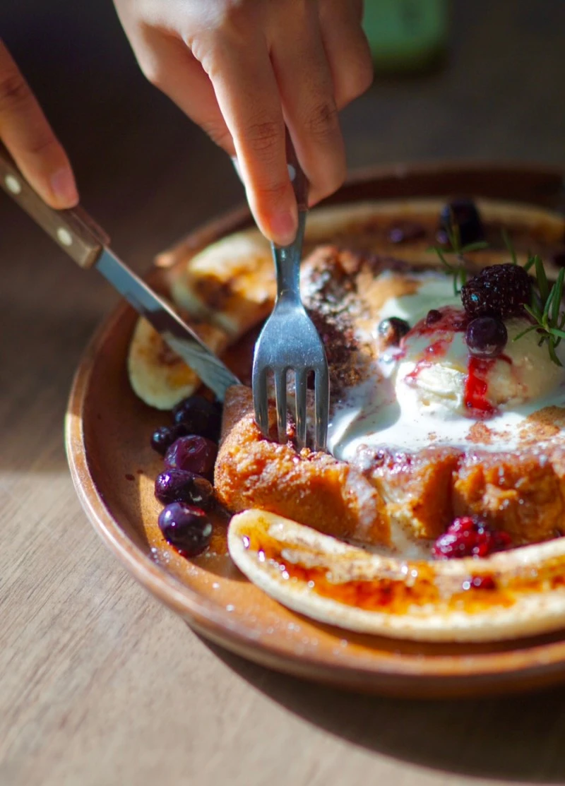 겹겹이 쌓은 페스트리 식빵에 부드러운 달걀물을 오랫동안 입혀, 최상급 버터로 노릇하게 팬에 굽고 또다시 오븐에서 높은 온도에 구워내 겉을 바삭하게 만들어주고 속은 부드럽게 익혀준 다음, 김 모락모락 막 나온 뜨거운 토스트 위에 시나몬가루 한가득, 브륄레한 바나나와 시원하고 달콤한 바닐라 아이스크림 한 스쿱, 그리고 시큼새큼 청량한 베리들을 가득 올려주면 이보다 더 달달한 하루가 없지요.