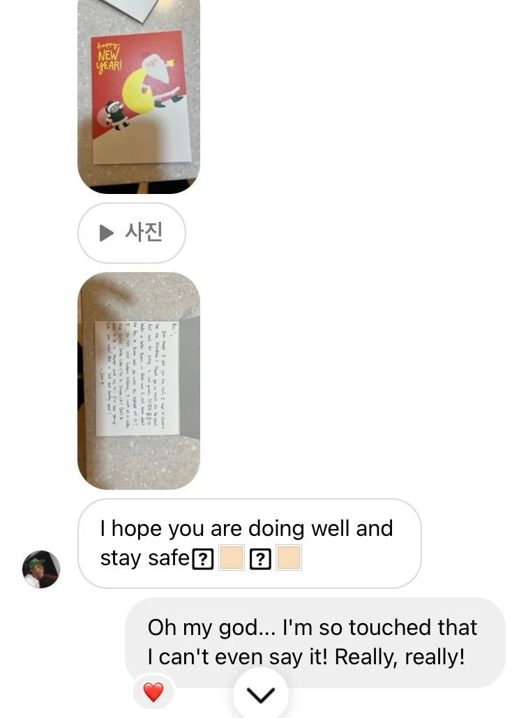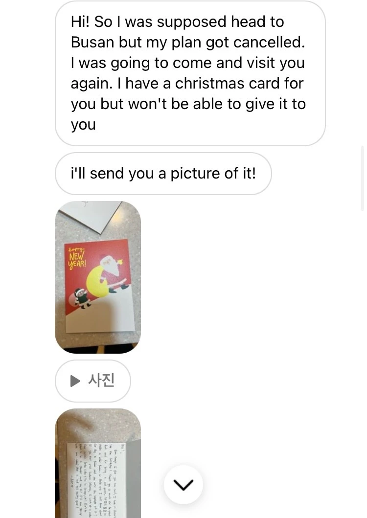 “Hi! So i was supposed head to busan but my plan got cancelled. I was going to come and visit you again. I have a christmas card for you but won’t be able to give it to you”