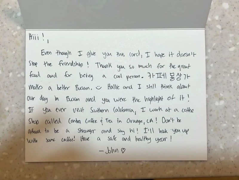 이 카드를 주지만 우리의 우정을 멈추지 않았으면 좋겠어요! 좋은 음식과 멋진 사람이 되어줘서 고마워요. 카페몽상가는 부산을 더 좋게 만들어줘요. halic과 나는 여전히 부산에서의 날들을 떠올리고, 그곳에서의 추억에는 당신이 하이라이트였어요! 만약 당신이 남부 캘리포니아에 오게 된다면 내가 일하고 있는 ‘ contra coffee e tea in orange’에 와요. 낯선 것을 두려워하지 말고 인사해 주세요! 커피를 가져다 드릴게요! 안전하고 건강한 한 해 되세요! - john