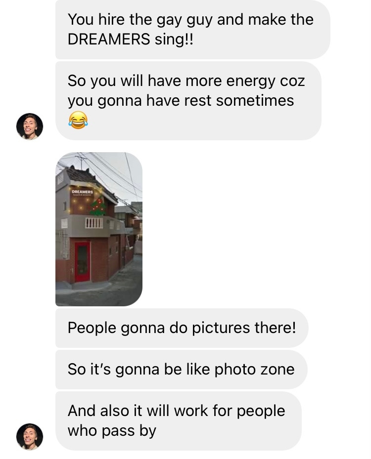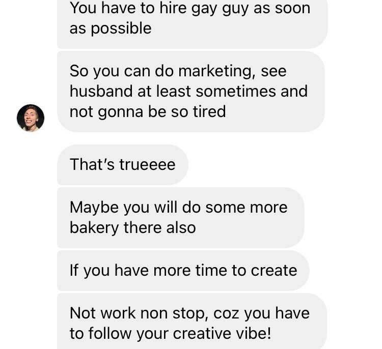 우리 가게엔 게이가 잘 어울릴 거 같으니 게이직원을 뽑으면 좋을 거 같다는 말을 이렇게나 캐주얼하게 하기도 하고. 내가 일을 너무 많이 하는 탓에 다른 걸 신경 쓸 겨를도 없을뿐더러 쉬지도 못하니 직원을 뽑아 내가 마케팅도 할 수 있고, 적어도 가끔은 남편과 시간을 보낼 수도 있고 (내가 일을 많이 하니 남편과 보낼 수 있는 시간이 너무 없어서 아쉽다는 말을 기억하고 한 말. 그리고 남편이 주말 내내 도와주는 것이 고맙고 미안하다는 말을 기억해, 남편도 쉬어야 한다는 말을 덧붙이기도 했다.) 늘 피곤해하지 않아도 된다는 말도.