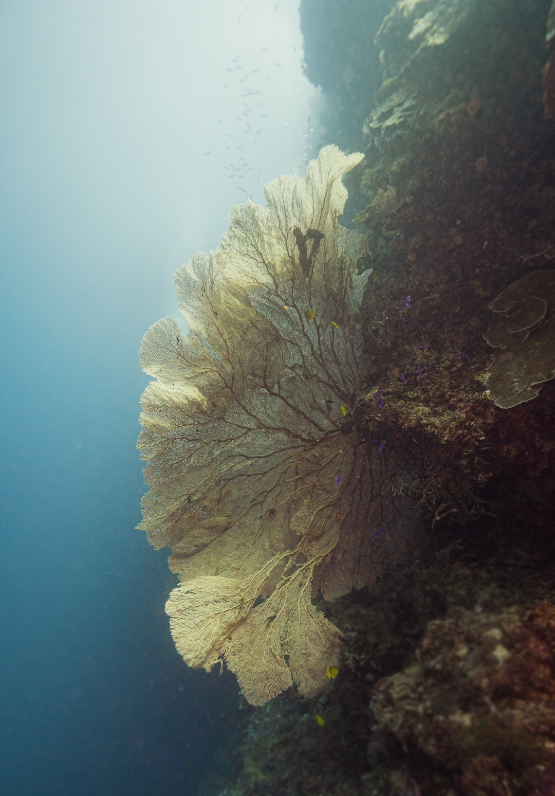 하나의 면이 아니라 미로처럼 이어진 선으로 사람 키를 훌쩍 넘어서는 큰 면적을 만들어낸 부채산호와의 만남은 아무리 반복되더라도 수중에서 늘 설레는 행복이다. 부채 산호에는 눈에 띄지 않는 다양한 해양생물들이 살고 있다. 새끼손톱보다 작은데 색깔까지 부채산호와 똑같은 피그미 해마를 찾는 건, 숨은 그림 찾기 최상 난이도 수준이지만 도전 욕구를 불러일으킨다.