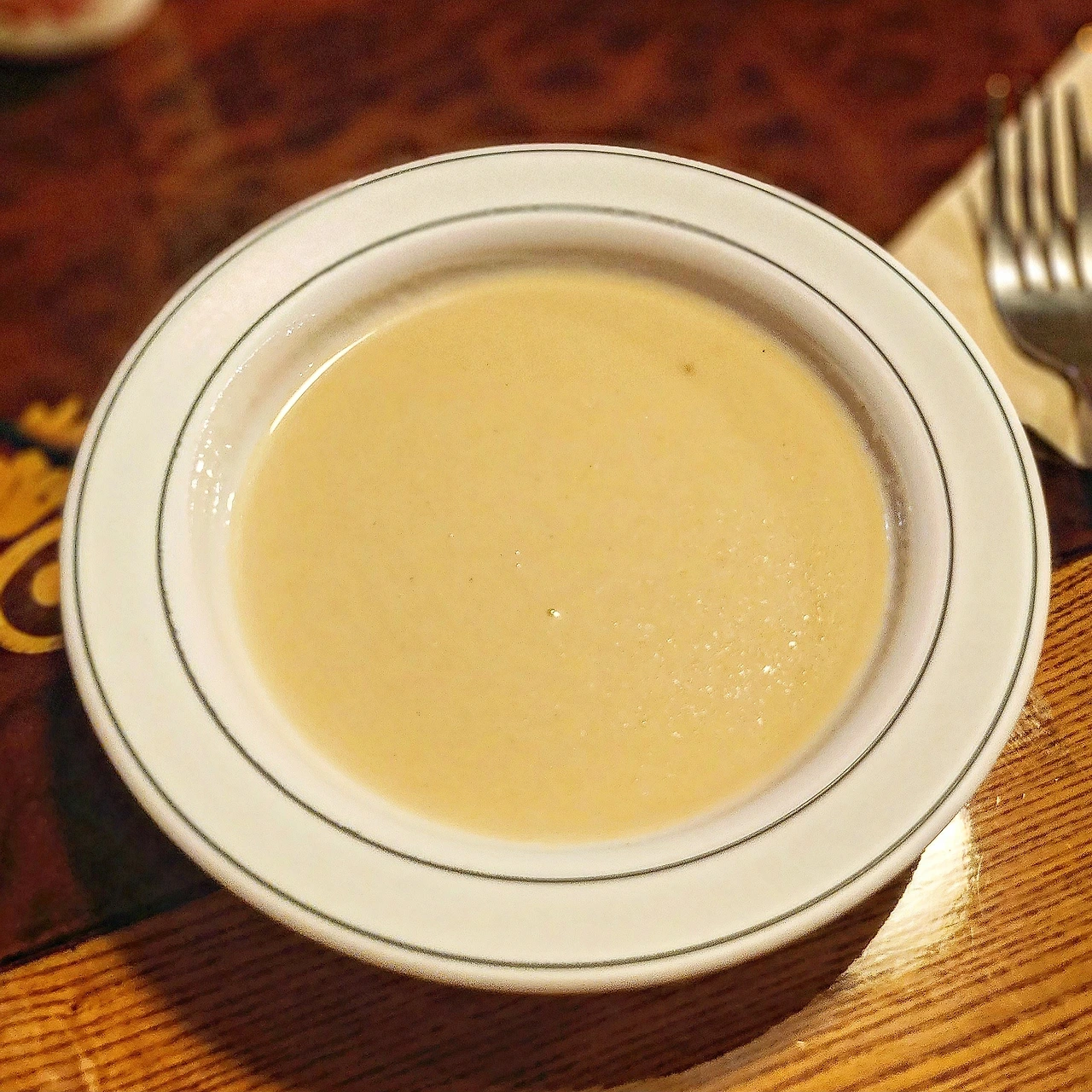 드디어 테이블에 자리를 잡고 움직일 때마다 뽀드득 소리가 나는 가죽소파에 앉아 잠시 기다리고 있자니, 먼저 수프가 차려졌다. 인당 1개씩 공평하게 배분되는 수프의 생김새는, 흔히 볼 수 있는 레토르트 수프와 다를 바가 없다. 건더기는 따로 없지만 점성 있는 말갛고 뽀얀 수프에 후추만 톡톡 뿌려 한 술 떠보면, 일반 크림수프보다는 다소 묵직한 온기가 온몸에 퍼진다. 살짝 고소한 단 맛도 느껴진다. 이미 매스컴을 많이 탄 집이라 그런가 그 비기는 이미 공개되어 있었는데, 땅콩버터를 넣으신단다. 희말간 그 빛깔에서는 전혀 눈치챌 수 없었지만 왠지 그 이야기를 듣고 나니 한층 더 고소하고 더 달게 느껴진다.