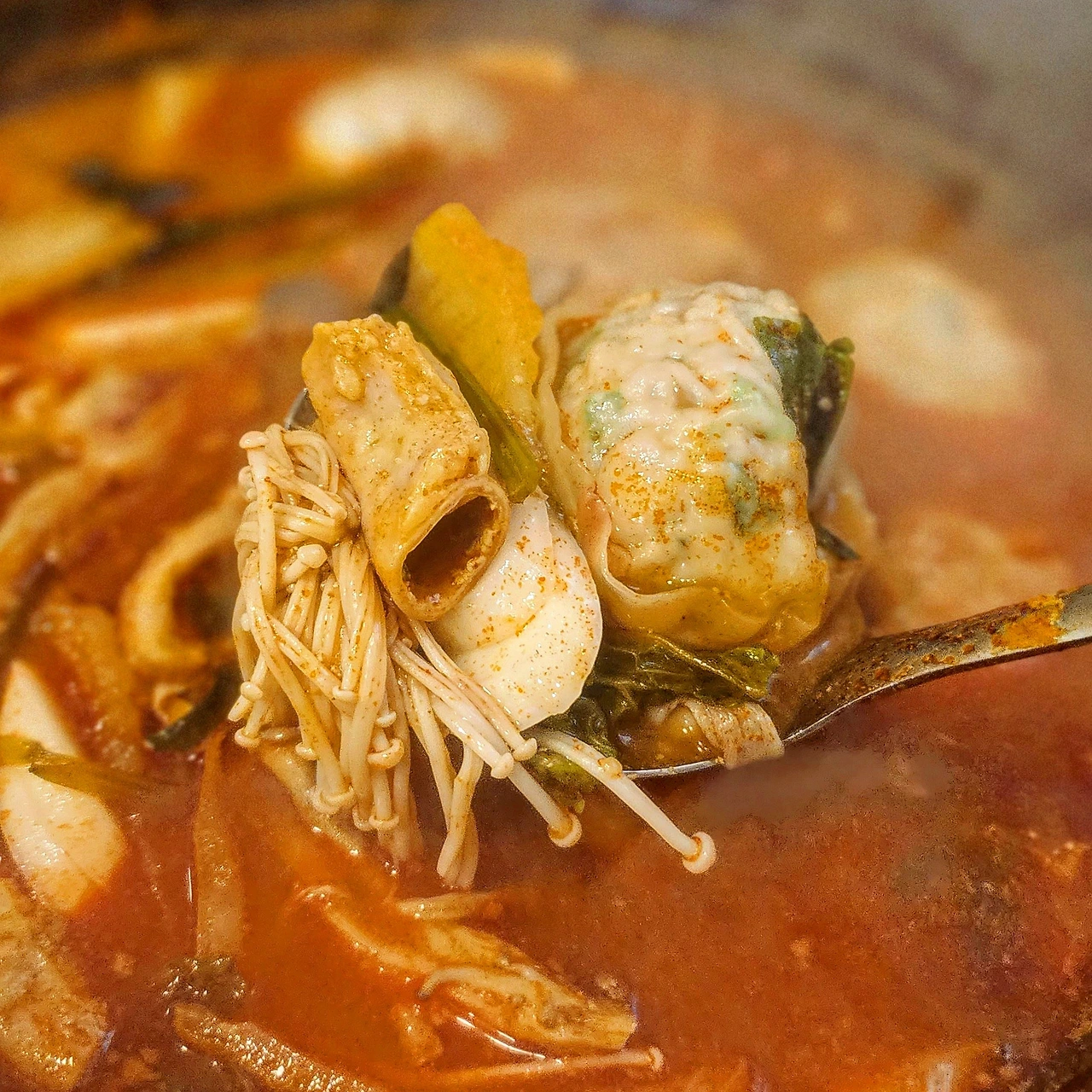 그리고 그 안주로는 만두전골 만한 것이 없다는 데에 모두의 의견이 모아졌다. 각종 야채와 멸치 등으로 국물을 진하게 우려내고, 잘 익은 김치도 넣은 빨간색 만두전골. 거기에 오늘의 스페셜 게스트는 양곱창울 더해주자. 쫄깃한 양은 그 통통함으로 밋밋하지 않도록 식감을 더해주고, 곱창에서는 곱이 우러나와 국물에 고소함을 안겨준다. 포르륵 끓여내어 건더기들을 한차례 건져 먹고 나면 국물은 어느새 색깔부터 한층 더 진해져 있는 걸 발견할 수 있다. 국물 한 술 다시 떠보면 초반에 맑고 개운하던 국물과는 어느새 또 다른 깊은 맛의 진국이 되어있는데, 만두를 넣어 줄 타이밍이란 신호다.