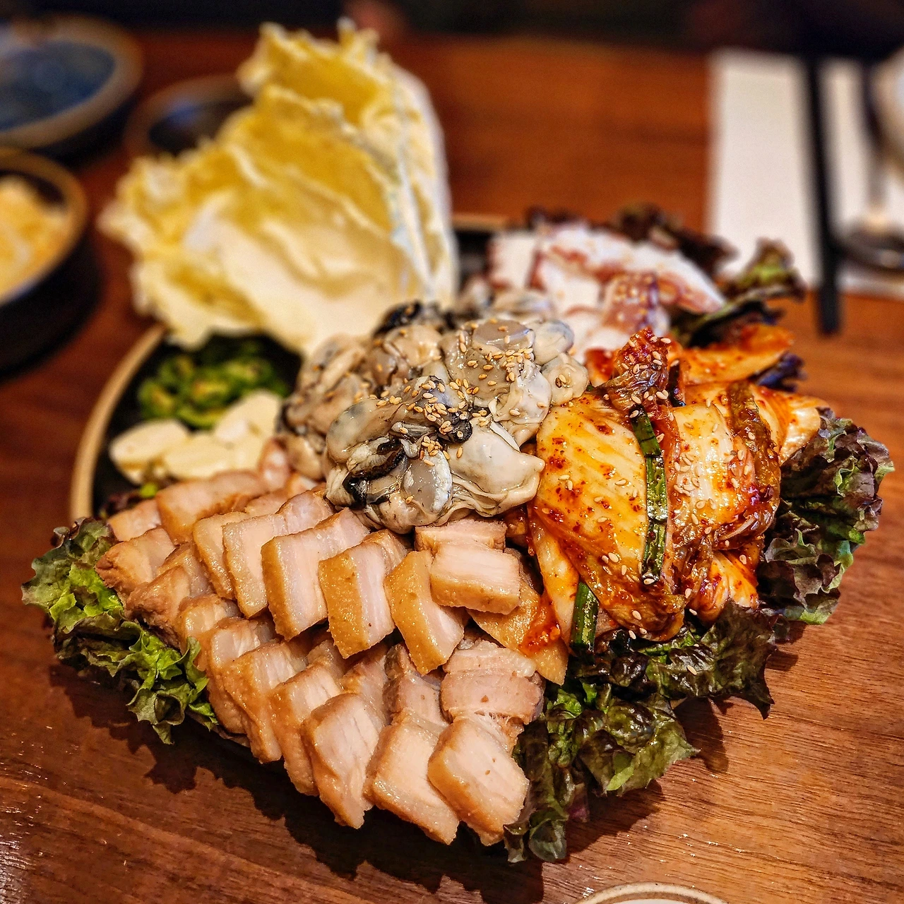 입구에서 안내를 받고 자리로 향하는 동안 다른 손님들의 테이블 위를 둘러보니, 이런 생각을 한 것은 비단 나뿐이 아니었나 보다. 그다지 크지 않은 네모 밥상 위 빼곡히 선연한 빨간빛 윤기 나는 생선회와, 접시가 버거워 보이도록 듬뿍 쌓아 올린 굴보쌈 사합이 올라찼다. 더 이상 시간을 지체할 수 없지. 이제는 익숙한 테이블 위 태블릿으로 능숙히 주문.