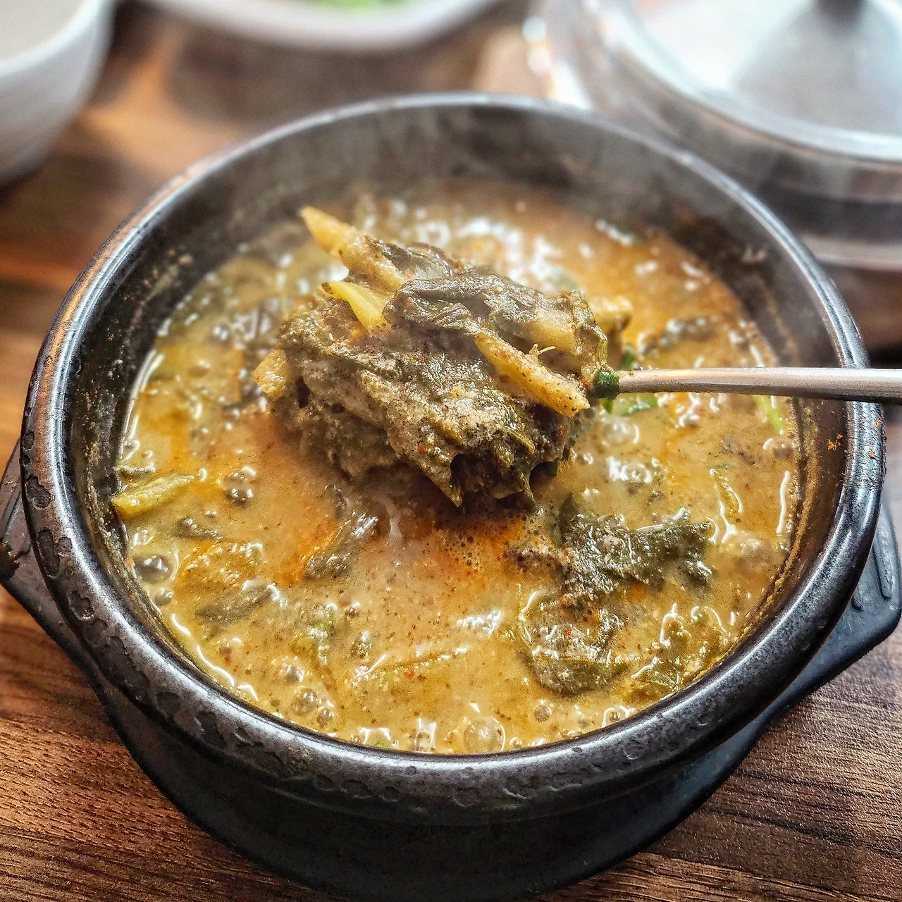 모락모락 나는 김을 호호 불어 한 수저 크게 떠올려보면, 입에 걸리는 것 없이 걸죽하게 갈아진 미꾸라지와 오래 끓여 흐들흐들 부드럽게 녹아내리는 시래기가 한 입에 들어온다. 들깻가루 한 숟갈 듬뿍 올려 잘 풀어주니 국물의 점도는 높아지고 고소함은 배가 된다. 원체 간을 장으로 칼칼하게 잘 맞추어 몇 술을 들이켜도 물리지 않고, 중간중간 섞박지로 개운하게 입맛을 잡아주어 가며 들이키면, '어허-' 소리가 연달아난다.