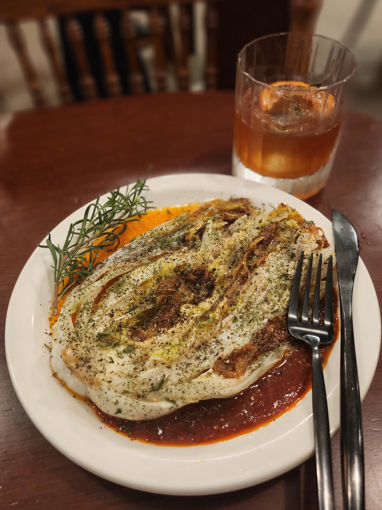속이 노오란 알배추는 흐드러진 꽃잎처럼 제 이파리를 접시 위에 양껏 펼치고 있었고, 그 양 옆으로 당근 퓌레와, 고사리 칠리, 두 가지 소스가 곁들여져 나왔다. 서로 다른 소스 간의 색깔의 대비가 곱고, 피어올라오는 버터의 향이 향긋했다. 잘 여문 심지 쪽을 나이프로 스윽 썰어보니, 야들야들한 끝 부분까지 한 잎이 오롯이 분리된다. 소스를 양껏 휘감아 입에 넣어보면, 뭉근한 당근 퓌레와 배추 자체에 사는 단 맛, 텁텁하지 않게 입안에서 기분 좋게 퍼지는 수분감, 그 위를 베일처럼 아우르는 버터의 풍미에 온몸이 사르륵 녹는 기분이다.