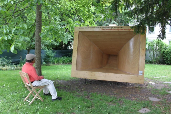 아내와 같이 계단을 내려와 후원으로 나오니 한쪽에 커다란 나팔 같이 생긴 나무로 된 조형물이 있었다. 스피커 같기도 하고 아니면 방금 전 보았던 베토벤의 보청기 같기도 했다. 나는 그 앞에 있는 의자에 앉았다. 스피커 같은 그 작품의 상단에 독일어와 영어로 써진 문장이 있었다. 읽어보니 ‘자연의 아름다움을 바라보고 네 마음을 다스려라’하는 뜻이었다. 나는 그것이 베토벤의 좌우명일 것이라고 생각했다. 언젠가 읽었던 로멩 롤랑의 베토벤 평전에서 베토벤이 ‘전능하신 신이시여! 숲 속에 있으면 나는 행복합니다. 거기서는 모든 나무들이 당신의 말씀을 이야기합니다,’라고 말했던 것이 기억났기 때문이다.