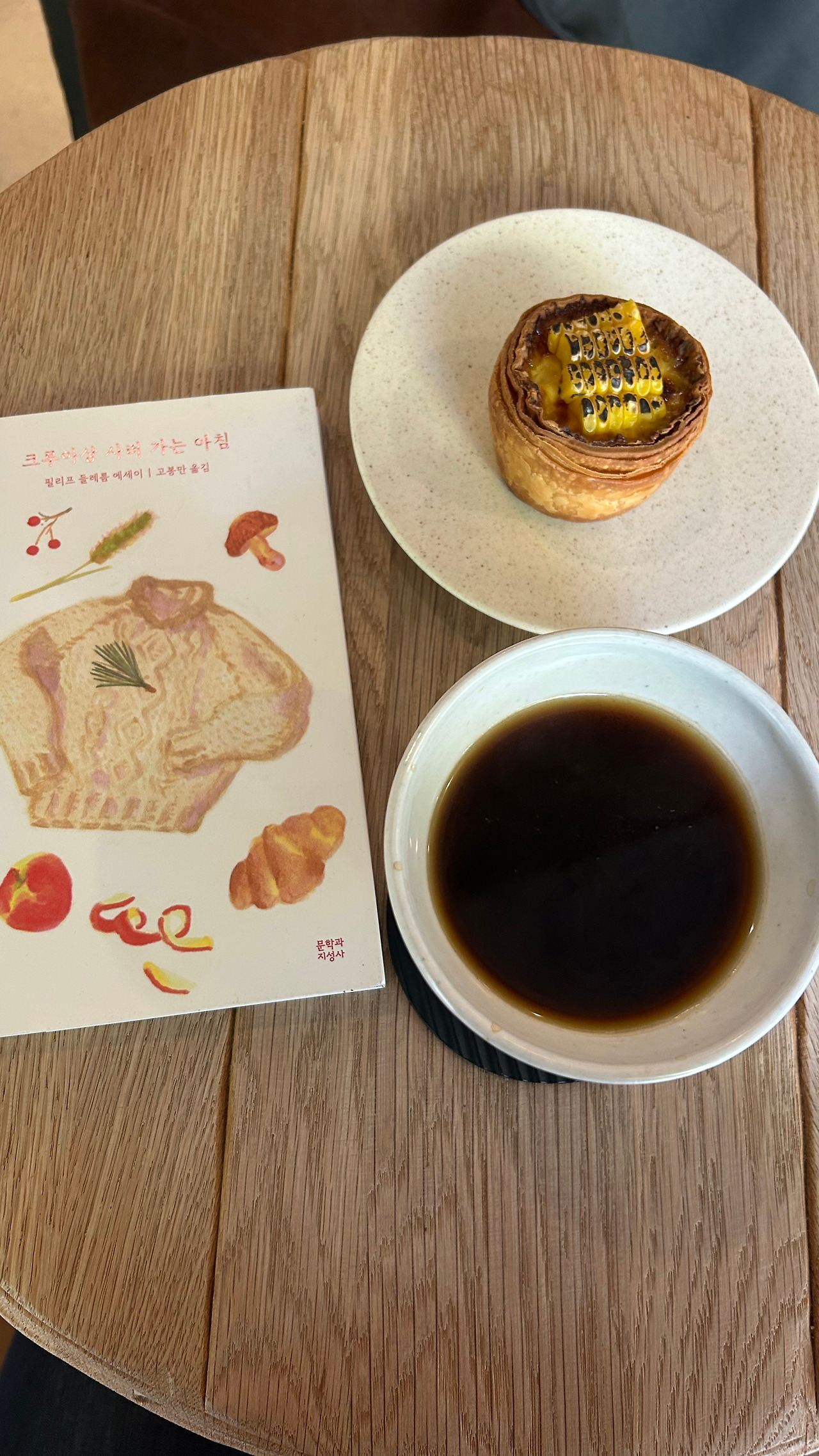 화장실에 다녀온 사이 이미 테이블에는 타르트와 따뜻한 커피 한 잔이 놓여 있다. 옥수수 타르트를 칼로 가르니 콰직 하는 소리가 난다. 일단 눅눅한 타르트는 아니라는 생각에 마음을 조금 내려놓고 사등분한 타르트를 입에 넣어본다. 달콤하게 퍼지는 옥수수 크림과 이따금씩 씹히는 옥수수 알들이 서울 한 복판에서 만나기에는 꽤나 놀라운 맛이라 살며시 웃음이 피어오른다. 이 타이밍에 오늘 챙겨 온 책을 가방에서 꺼내본다. 표지와 제목이 마음에 들어 고른 필리프 들레름의 <크루아상 사러 가는 아침>은 오늘의 분위기와 꽤 잘 어울린다.