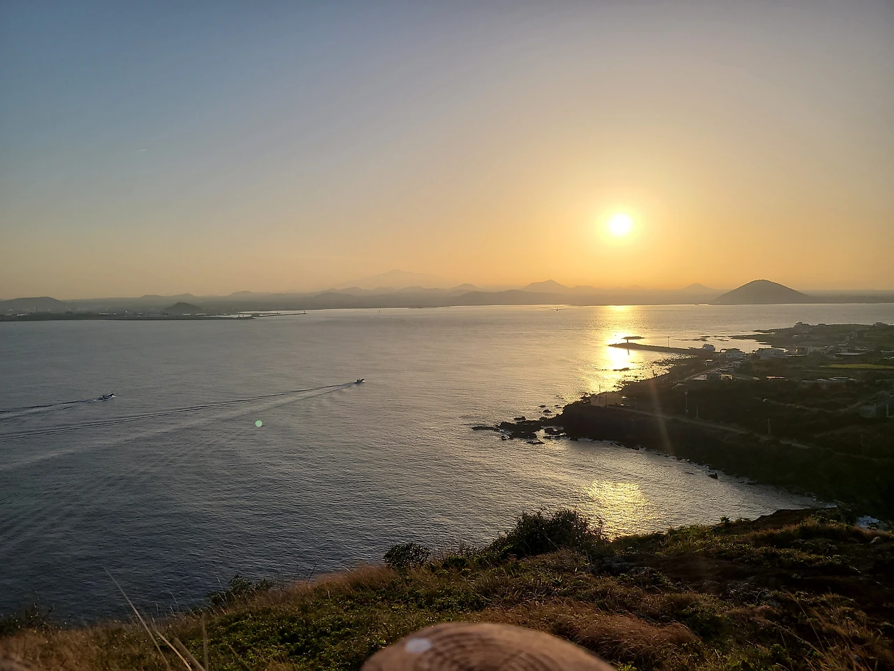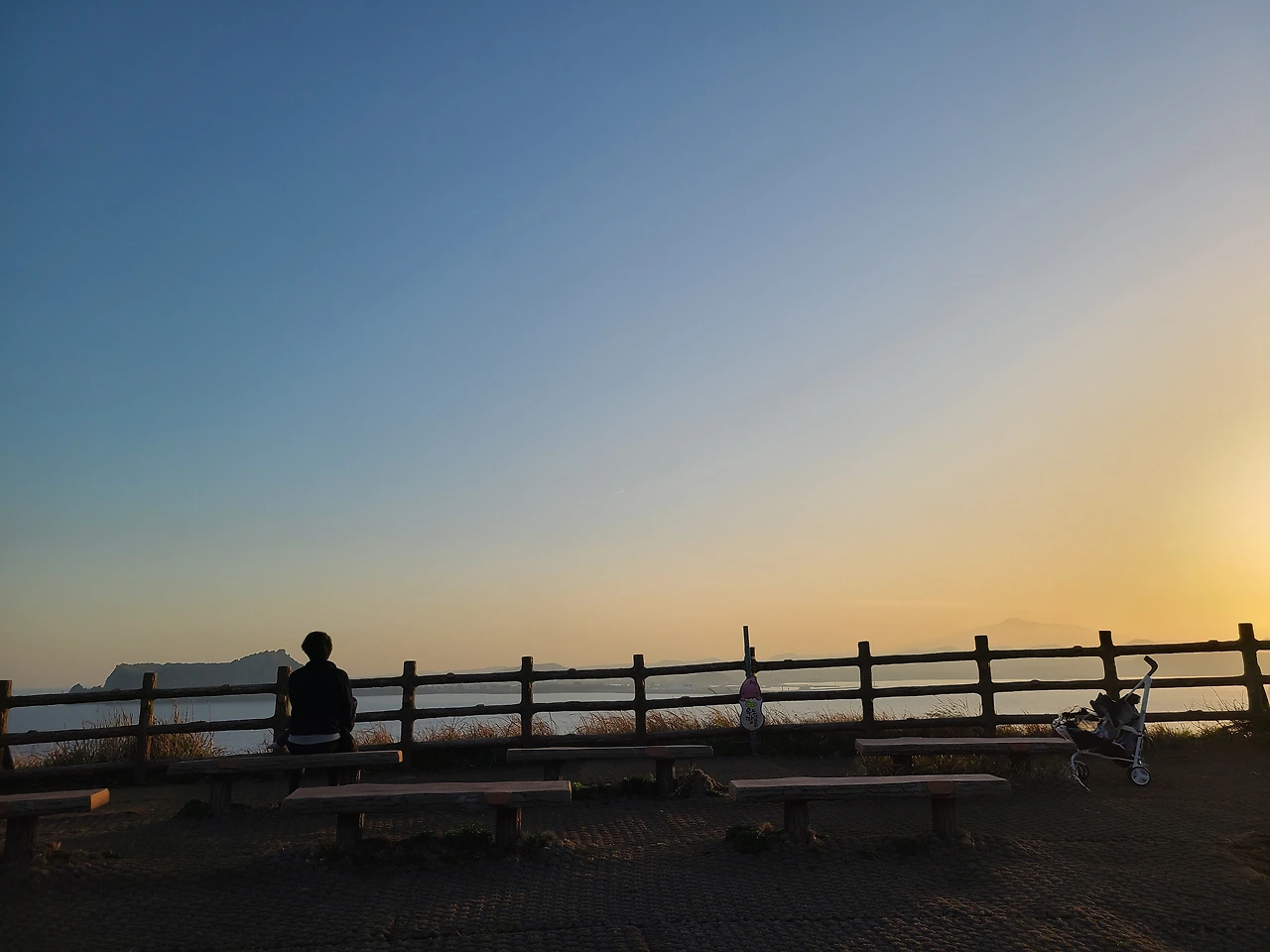 크게 높지 않아 오르기에 부담 없다하는 제주도의 오름들이지만 7개월 아가와 함께 가기엔 어디든 쉬운 곳이 없다. 그래도 한번 도전해본다. 오름까지 길지 않은 길이었지만 역시 쉽지는 않다. 유모차를 끌고 갈 수 있을 때까지 끌고 가 봉우리 거의 다와서 아가를 안는다. 눈앞에는 일몰과 함께 제주바다가 한눈에 펼쳐졌다. 너무 좋은 걸 보면 말을 서로 잊는다. 제주에 와 몇번 그런 순간이 있었다.