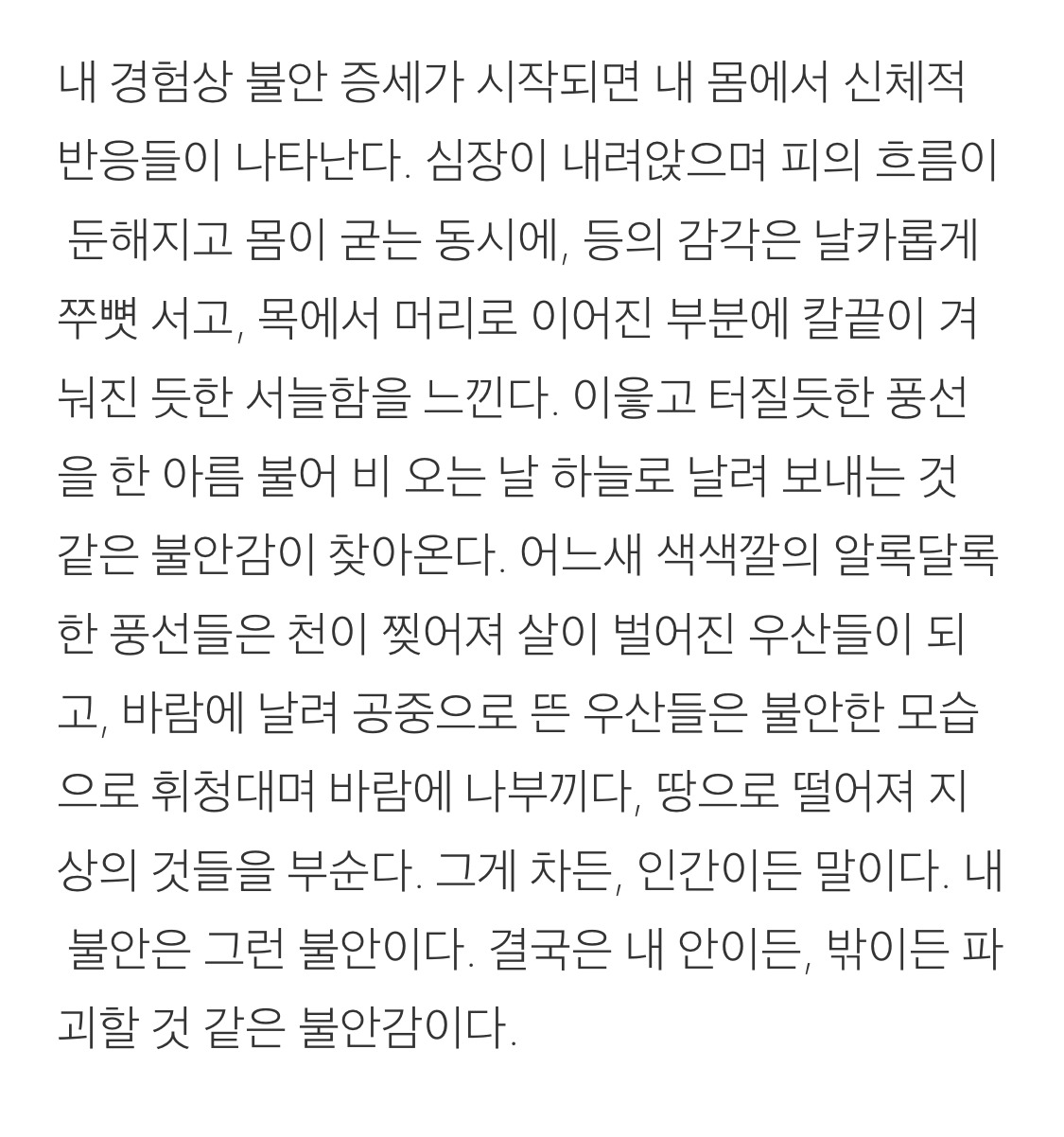 나는 불안의 증상이 올라올 때마다 의도적으로 감정을 차단하고 의식을 꾸욱 내리눌렀다. 그렇게 나는 아무렇지 않은 척 일상을 보냈지만 내 속은 계속해서 닳고 있었다.