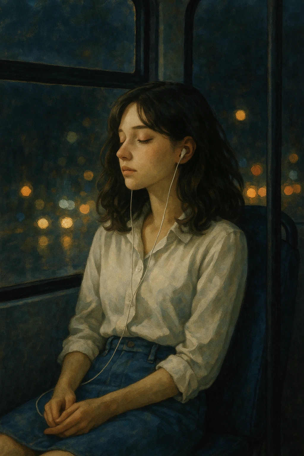 이어폰에서 잔잔한 피아노 음악이 나오자
